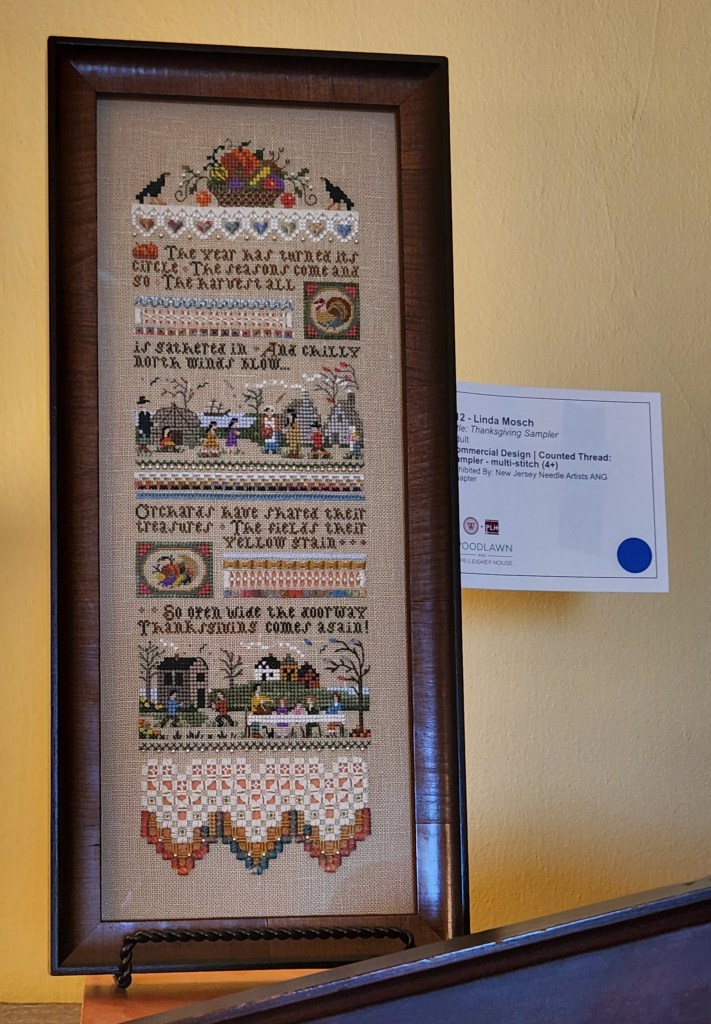 Samplers range in variety as usual from traditional to more modern and my featured sampler is by Linda M from NJ Needle Artists who puts a lot of effort into supporting Woodlawn. Congrats to Linda for a Blue Ribbon with Thanksgiving Sampler.