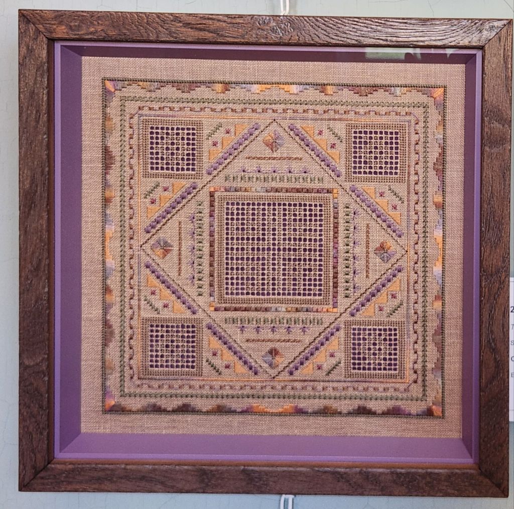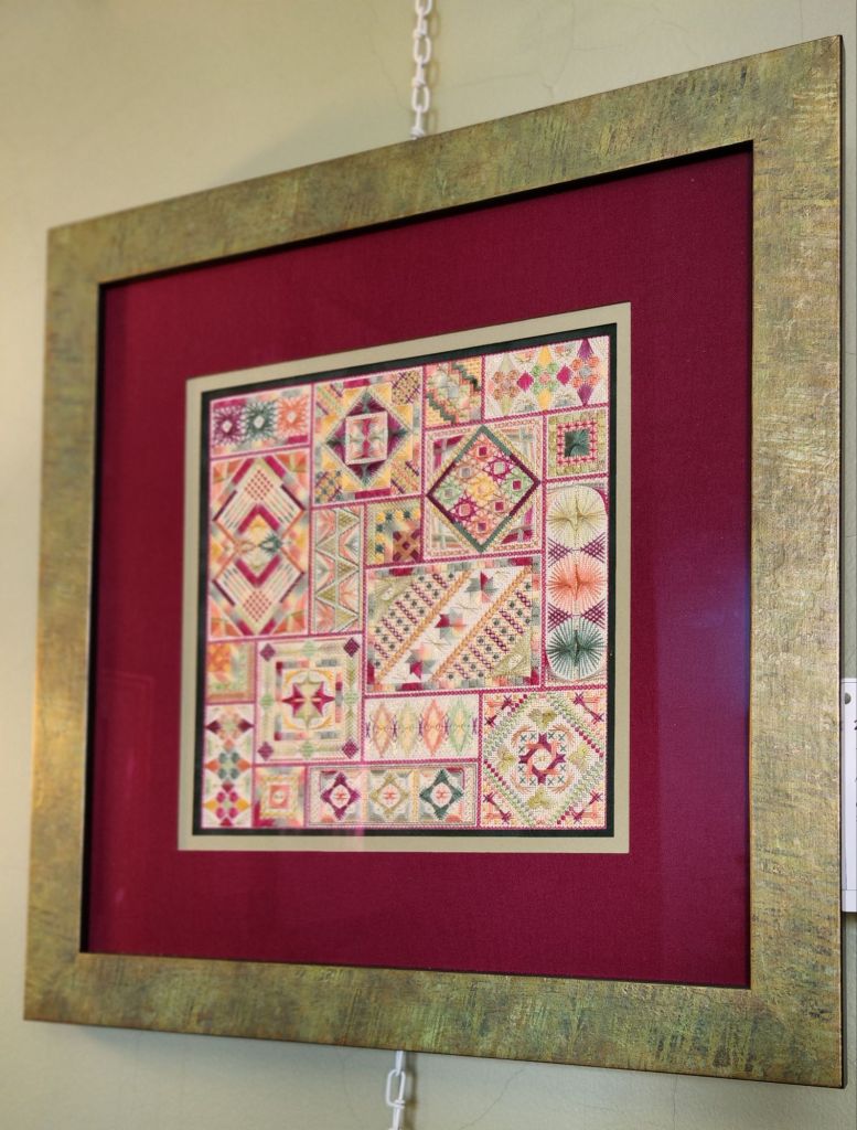 It looks like the eastcoast stitchers are quite taken with Ann-Marie Anderson-Mayes of Beautiful Stitches (several designs were shown). Here’s Versailles, which will be one of the pieces Ann-Marie will be offering to NJNA members after the ANG 2024 KC Seminar. Sherri Gordon with the EGA Mollies chapter (who have stitched my Overdyed Spools and A Spring Sampler) exhibited hers.