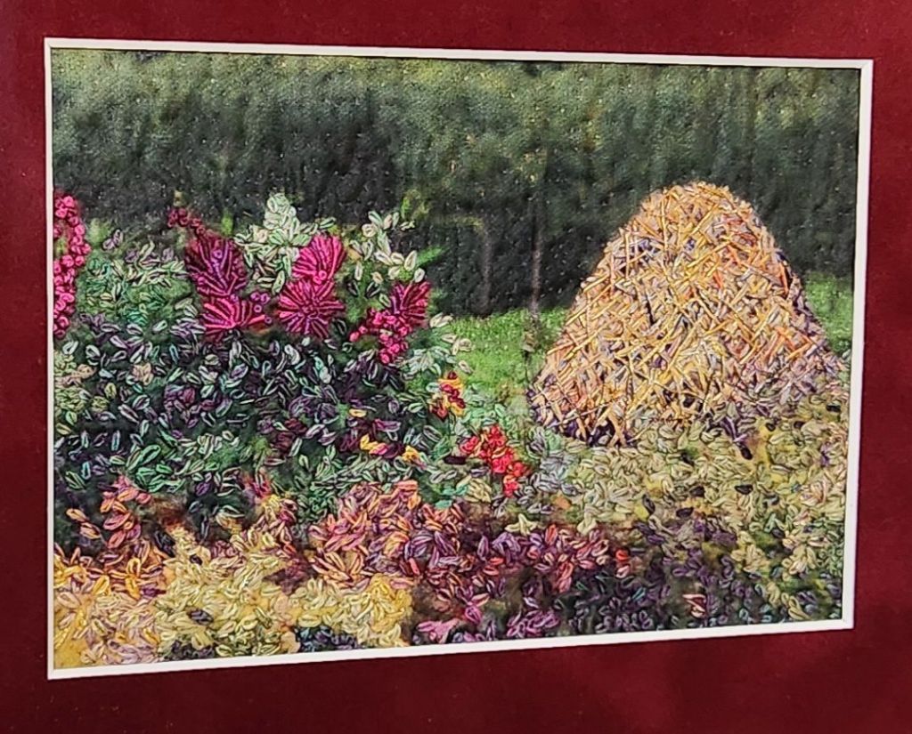 The original pieces by other people (which I won’t show without permission) were quite amazing. The surface embroidery of snowflakes captured in negative and positive space by Tina T was stunning. Ekaterina S’s Snowy Evening was stitched on artist’s canvas (docents said she was new to this country and didn’t know what “canvas” meant). Hers was originally placed in the “canvaswork multi-stitch” category but later must have been switched to “surface embroidery” because artist’s canvas is not a countable ground. Her piece titled Autumn is on the same artist’s canvas and is stunning with mist appearing to float up into the hills of green, yellow, and red trees.