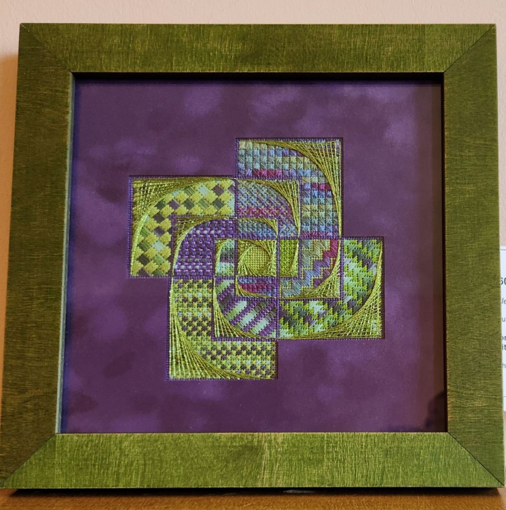 My ANG Main Line Stitchers chapter is going to be doing Fibonacci Swirls by Olivia Hartshorn from the ANG Needle Pointers magazine (March-April 2022 issue). Beth Peternell’s color choice is fantastic and beautifully framed.