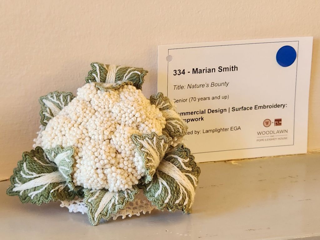 I was really taken by the head of cauliflower done by Marian Smith! It was stitched in shaded wool on cotton homespun and uses wire to hold the shapes of leaves.