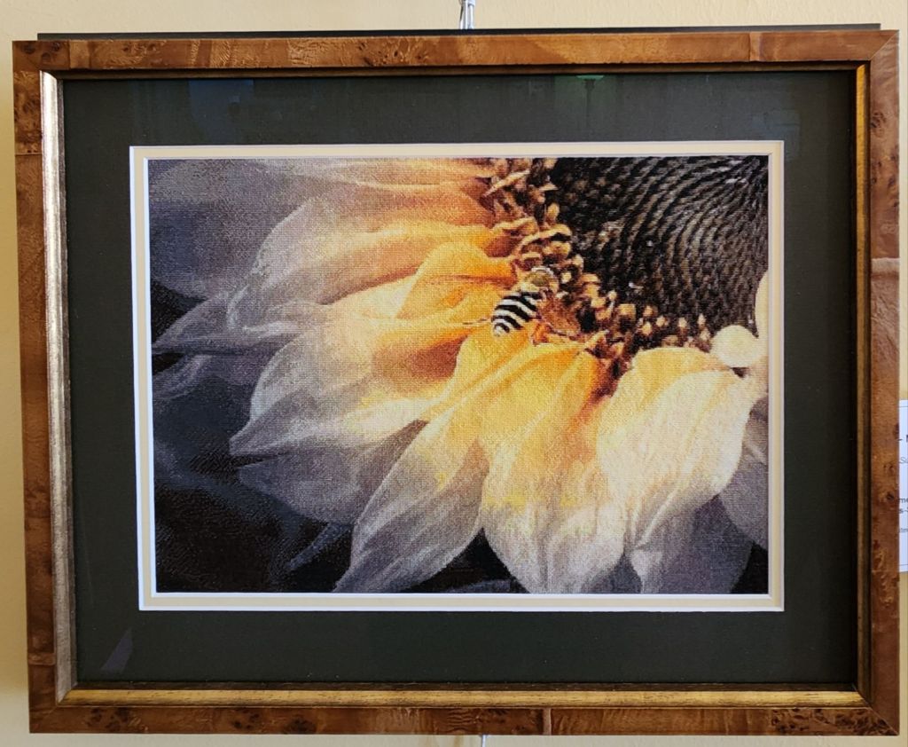 The EGA Colonial West Jersey (CWJ) members had a variety of pieces on display. There were quite a few impressive cross stitch pieces, including Nancyanne Carkeek’s Sunflower Bee.