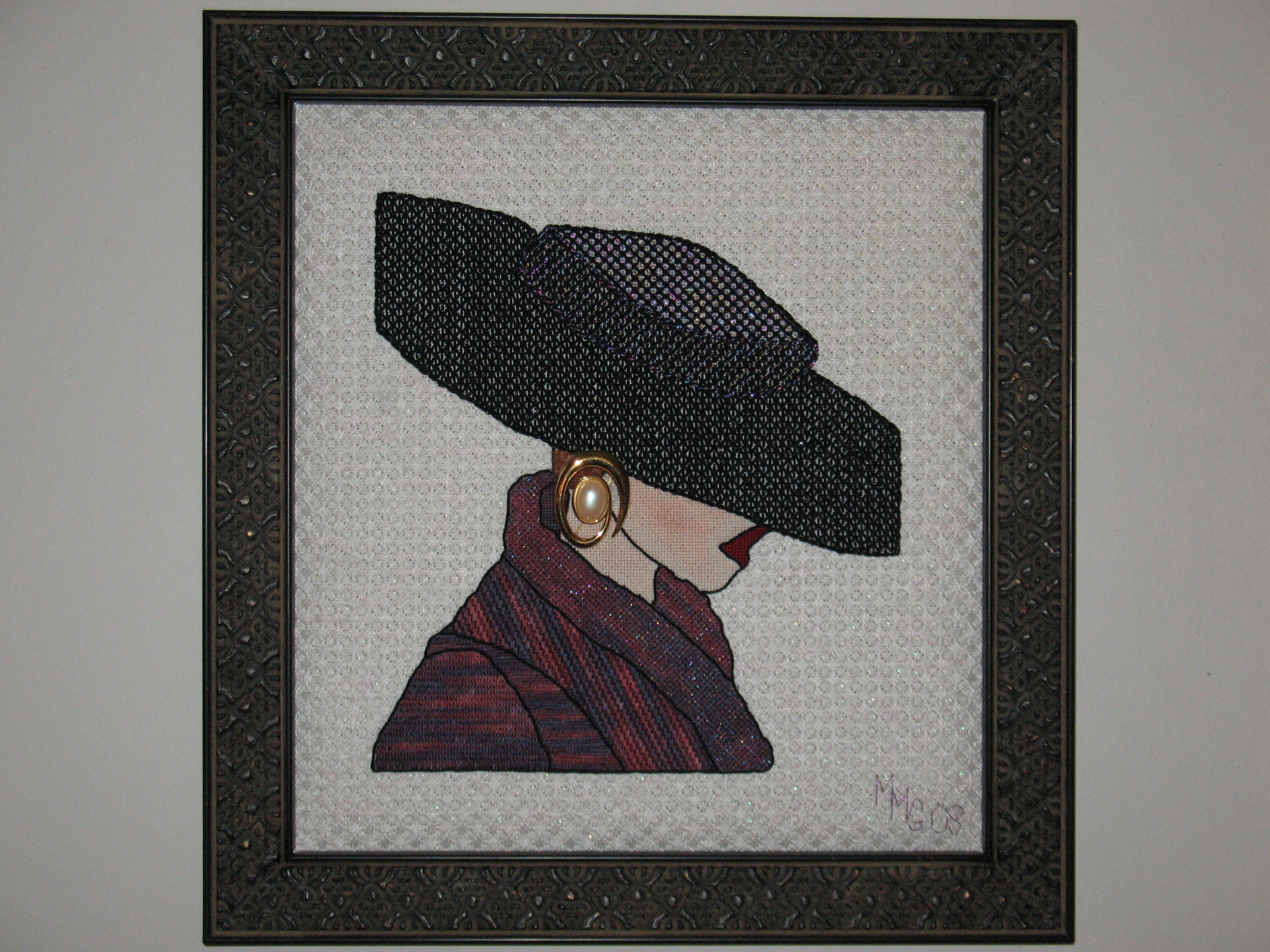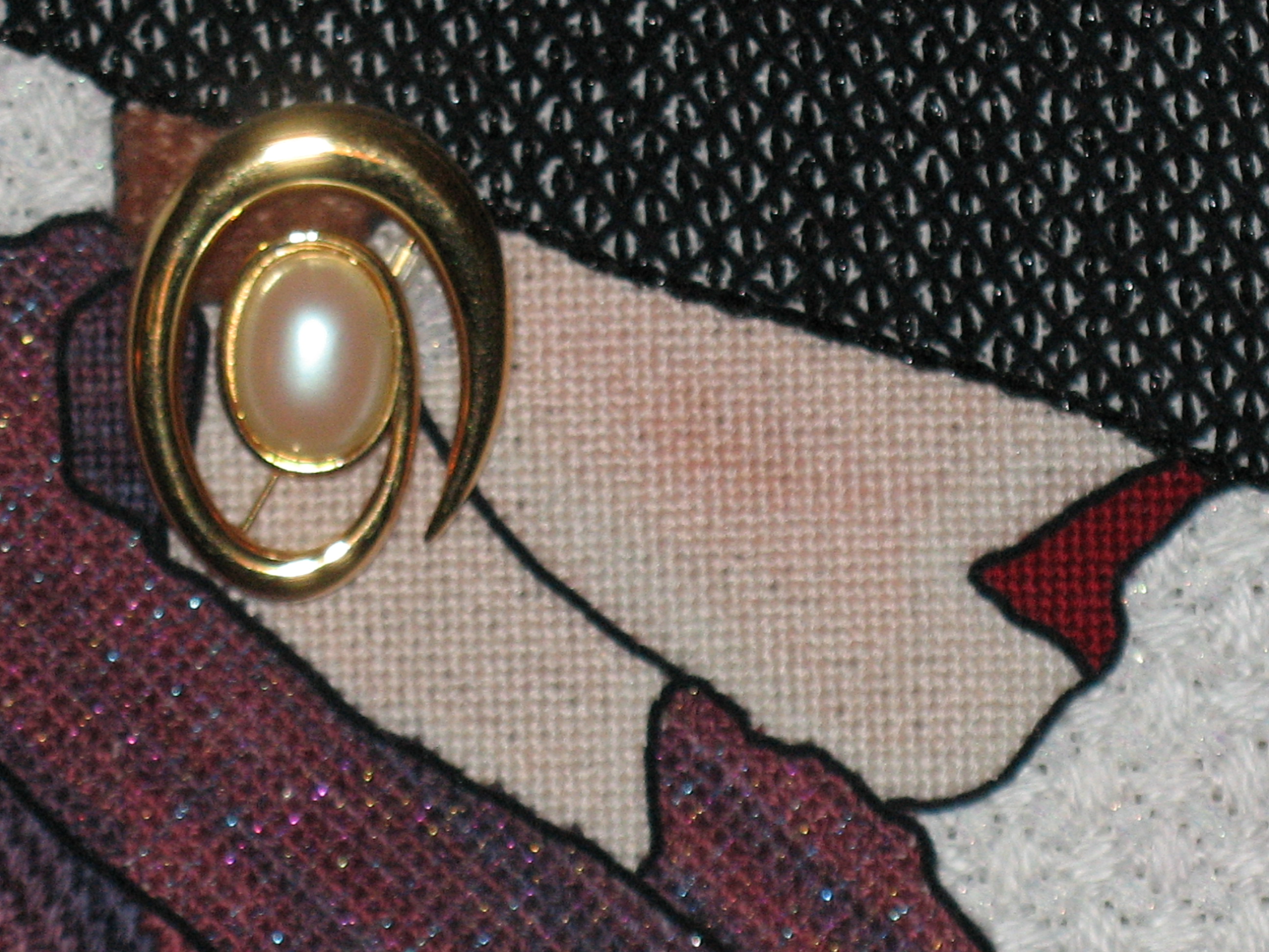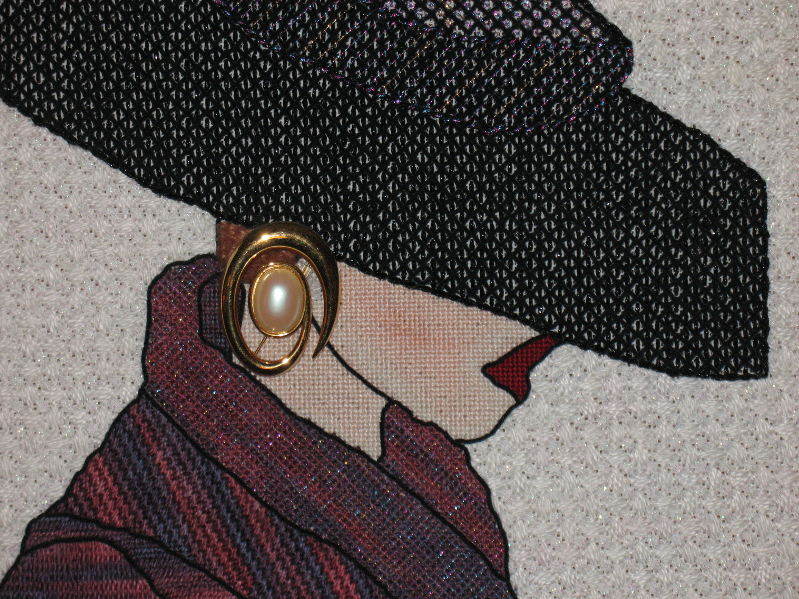 This mysterious woman appeared at my hair salon as a stained glass piece (original designer unknown). As I continued to be intrigued by her at my appointments, I decided she’d look striking in needlepoint. So, I took a photo and looked through my collection of pins for one to adorn her hat. But, as soon as I saw the pearl and gold pin, I knew it was ideal for her earring. I’d been designing needlepoint to showcase jewelry, mainly pins (which I call “Pinsations” and is designed so that the pin can be removed and worn).