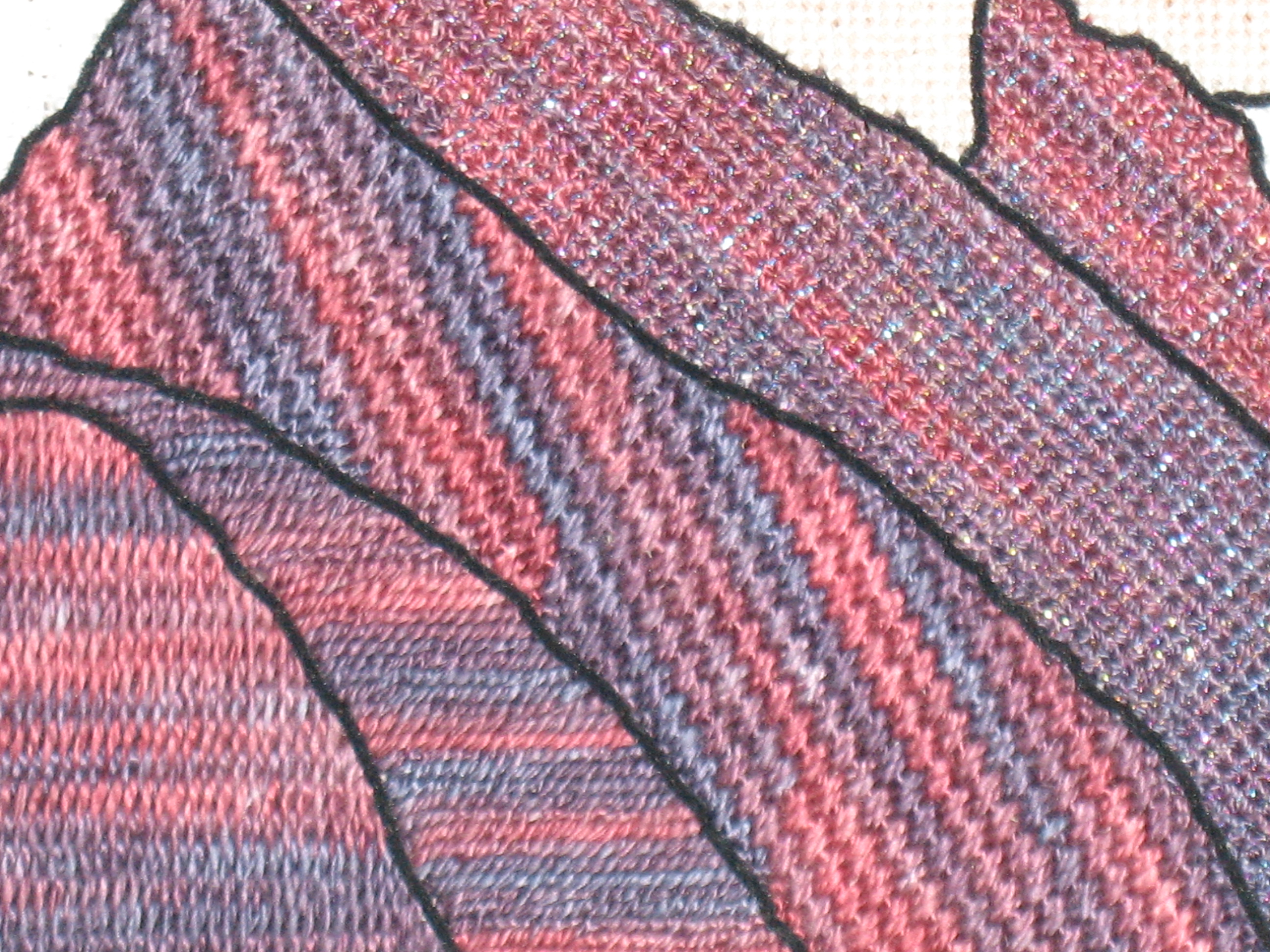 The parts of the coat include: interlocking gobelin (5×1 and 2×2) & diagonal cashmere. The collar is padded alternating continental & free-style weaving with Accentuate (275) to match Watercolours (090 Ruby). The outline of the coat is couched Petite Very Velvet. The face & lips are tent stitch. The hat is Alicia’s Lace Variation with the outline using threaded back. The earring (under the pin) is octagonal rhodes & the hair is turkey. The background is the palace pattern.
