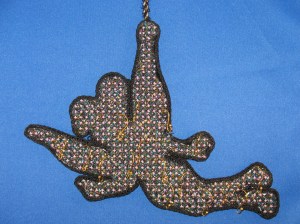 The threads are Gold Rush 14 Variegated (231C) and Kreinik #16 Braid (057F) using Criss Cross Hungarian (from Stitches To Go by Suzanne Howren and Beth Robertson). The Kreinik is fluorescent. I expected the thread would be cool to glow in the dark but that didn’t pan out. Even when I held the thread under a lamp, the glow was faint & brief. Oh well. I still liked how the piece turned out.