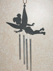 I made this Fairy for one of my nieces, Erin, to hang on her wall to hold necklaces. I used the outline of an outdoor wind chime from a friend’s yard.