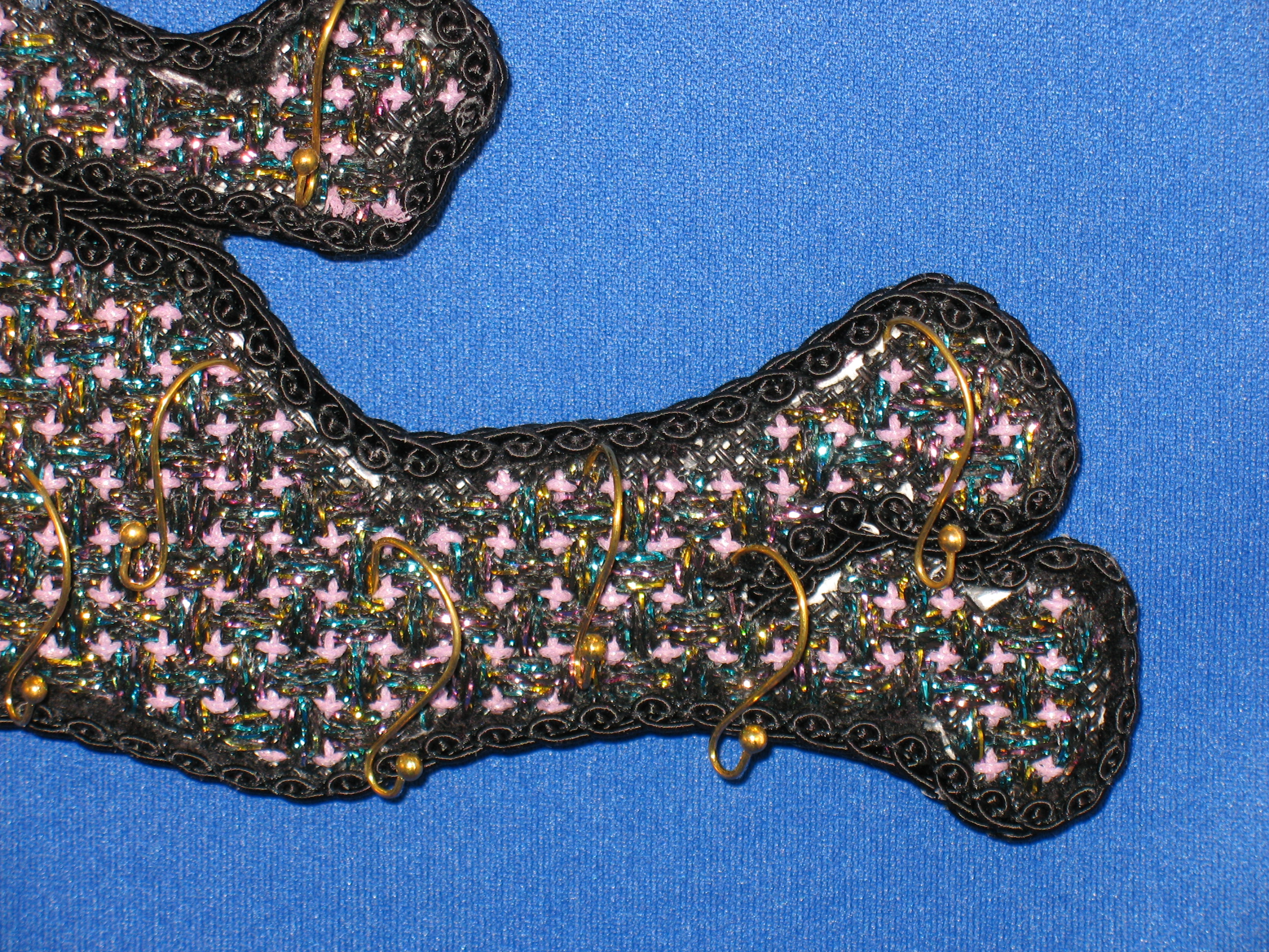 The threads are Gold Rush 14 Variegated (231C) and Kreinik #16 Braid (057F) using Criss Cross Hungarian (from Stitches To Go by Suzanne Howren and Beth Robertson). The Kreinik is fluorescent. I expected the thread would be cool to glow in the dark but that didn’t pan out. Even when I held the thread under a lamp, the glow was faint & brief. Oh well. I still liked how the piece turned out.