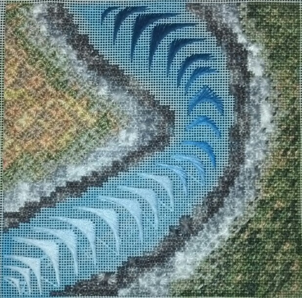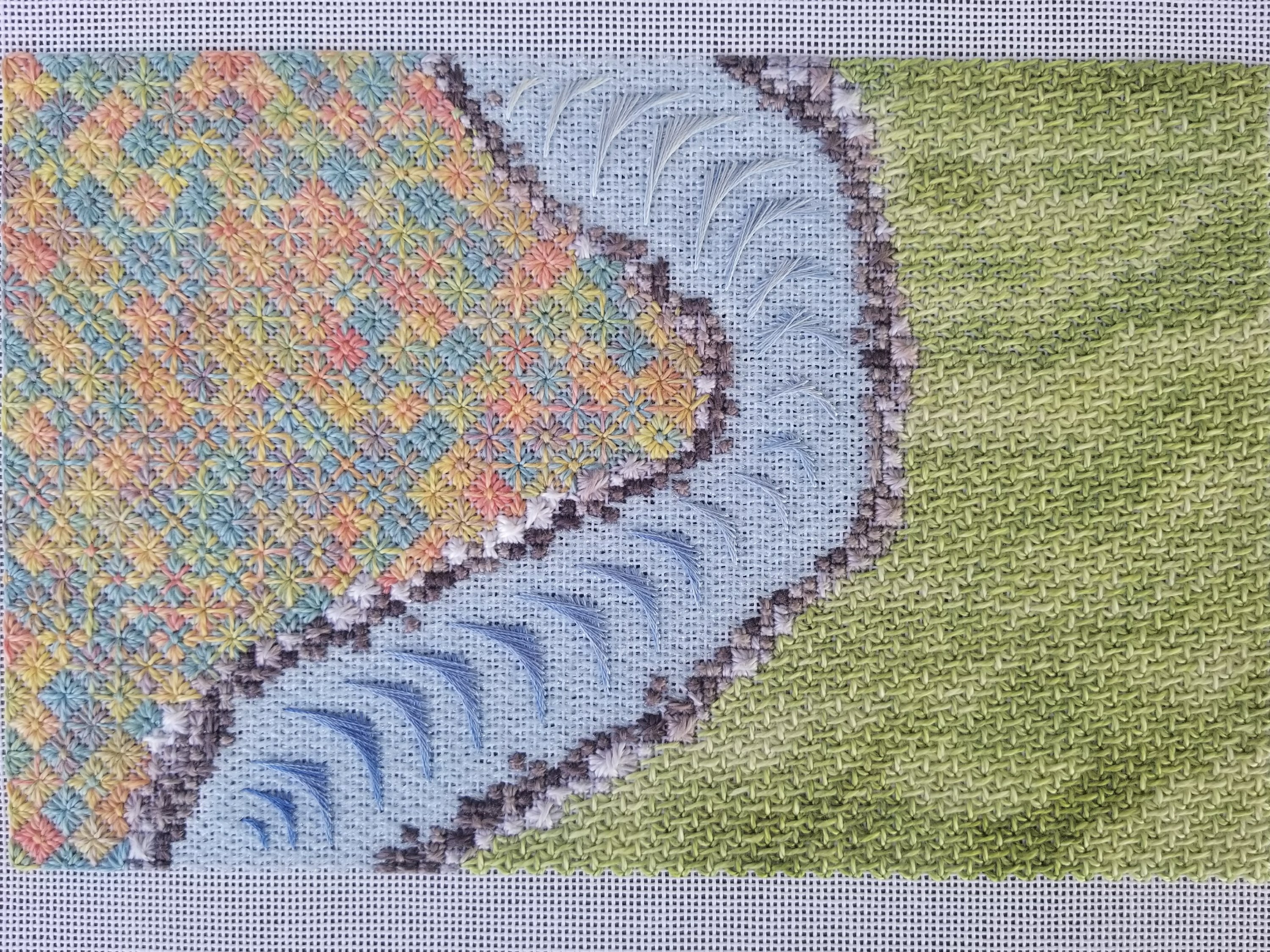 I was almost done with the wild flowers when I saw Janet Perry’s Nuts about Needlepoint’s blog about an ‘open water stitch’ that would work for my river. She said it is a slight variation of a stitch David McCaskill used for an ANG Stitch of the Month. So, in addition to the waves, I added some water using Water n’ Ice. It’s WT1, a translucent thread, perfect for a reflective surface. However, I had quite a time with that thread fraying.