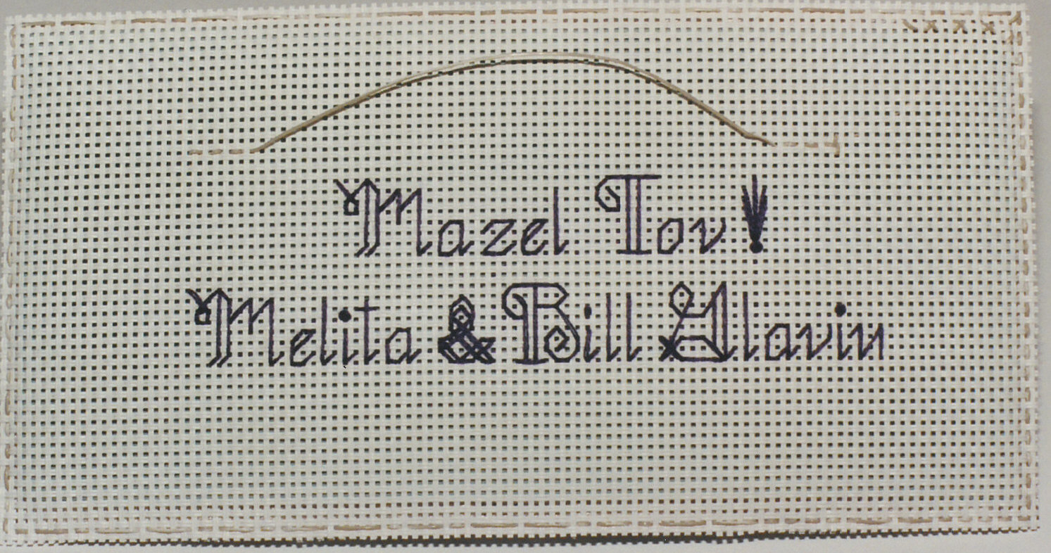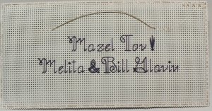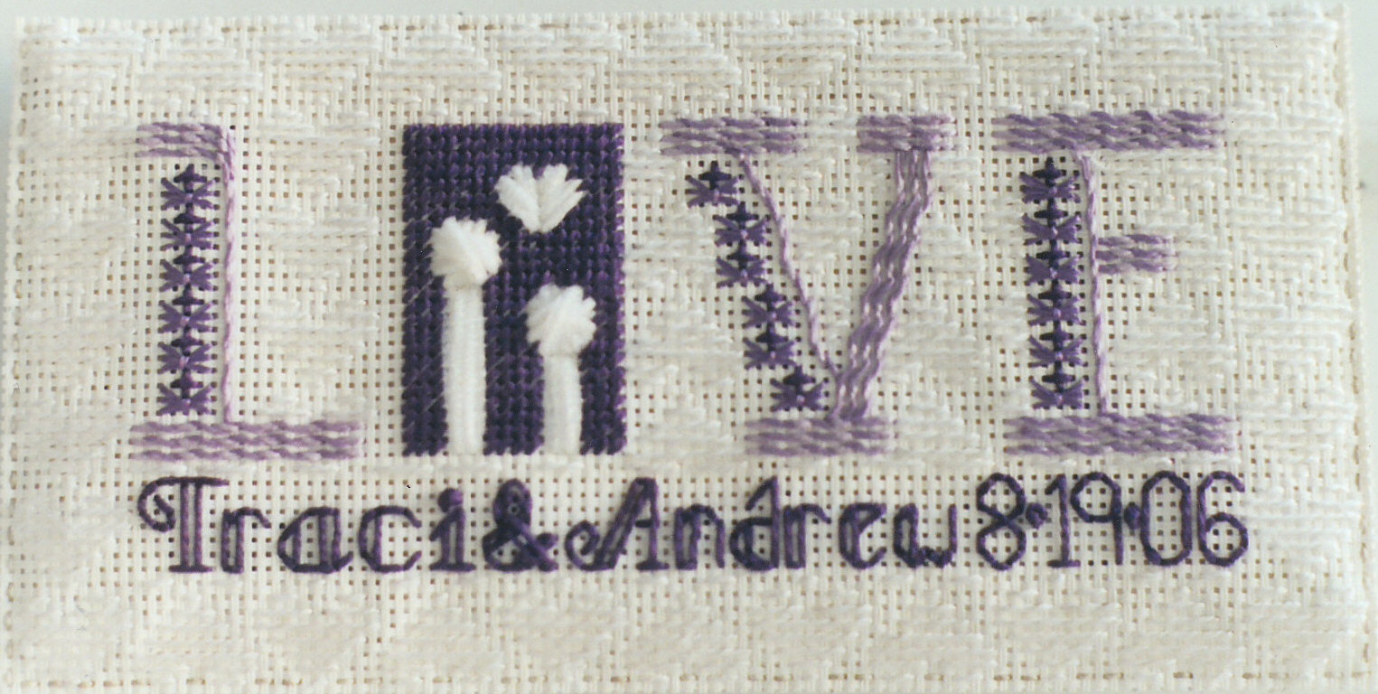 This is a “Pinsations” original design & stitch selection. The pin is added to the piece so that the pin can be removed, worn, & replaced. I made this to see if I could get something to recreate for other folks as wedding gifts. I only had two other weddings worthy of creating a piece of needlework since I did this & one I did differently (you’ll see).