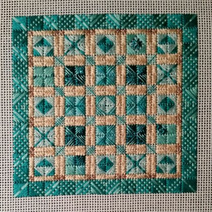 There are 10 variations of the Scotch Stitch in the 25 larger negative spaces (8 by 8 areas; A-G), 3 variations in the smaller negative spaces (4 by 4 areas; a-c), and 6 variations (6 by 6 areas) repeating to form the outermost border. There’s lots more variations that could be cooked up using more Scotch variations, more threads, or both!
