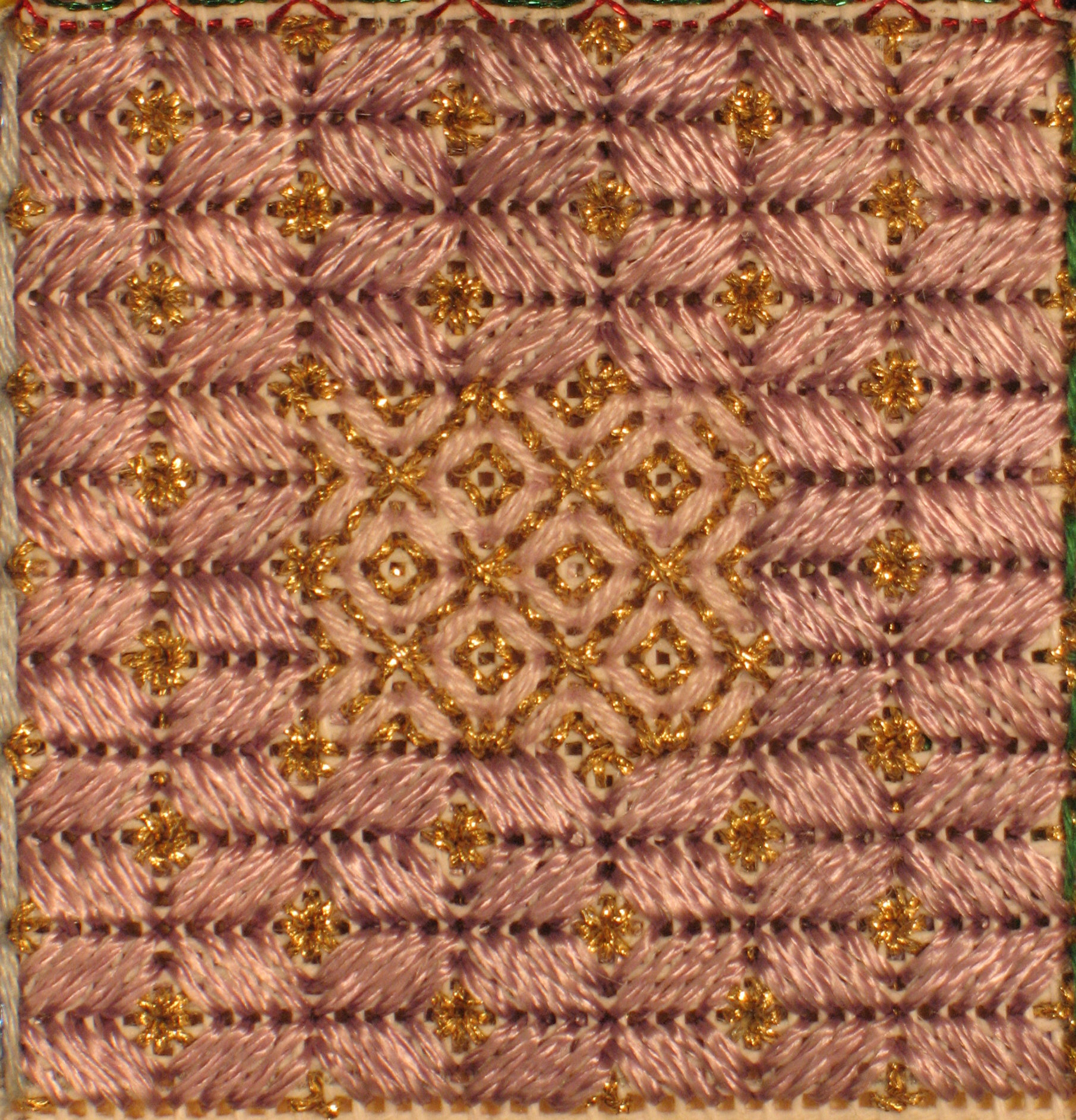 You won’t be surprised when I tell you I took Mary Shipp’s ‘Understanding Color’ class – that was in May 2005. When I created this piece, “Thread Play” for one of the lessons, she said I gave her “quite a shock”. Tasked to experiment with various effects that you can get with various threads, I prepared 25 samples. I’ve included close-up pictures of 2 of my favorites.