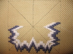 Taking a class in 1&1/2 hours isn’t a lot of time especially when it’s a 4-way bargello. But, Stephen at Rittenhouse Needlepoint made it work by designing a small enough piece to demonstrate the essentials. We had a variety of colors to select from – already bundled. The base row took the longest to stitch (& unstitch) requiring concentration. Turning the corner proves to be the next trickiest area. After a full day of work, I was very pleased with the instructions, materials, classmates, refreshments, & to get this much done during class: