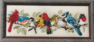 This must another “vintage” piece although I don’t have any of the information. It was a kit my mother bought & asked me to finish for her a few years ago. All in tent/continental. The black & white coded chart was tough to follow. There a some lines on the piece to follow but then you had to look at the chart too. I was glad when that was done. But, she loves it. Big bird lover.