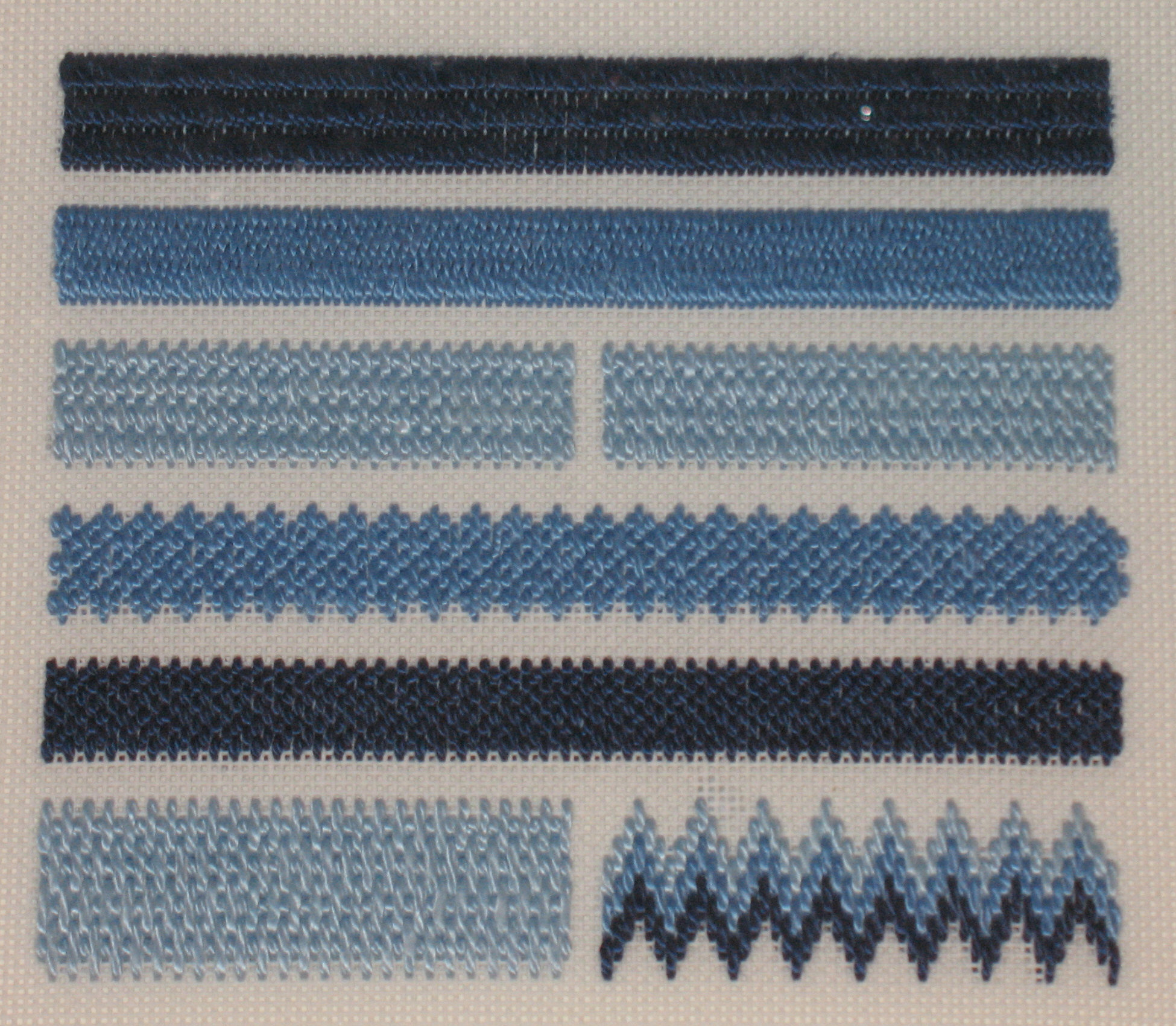 I took this basic course in 2003 to create 4 samplers (6”x6”). Nanette taught everything from preparing canvases to color terminology to 31 different stitches. Right from the start I was impressed by the packet of materials, the option to contact her by email, & her responsiveness when I did.