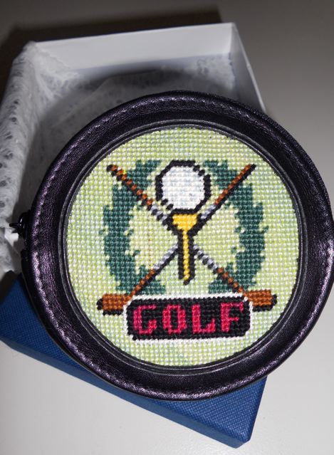 So, we were having a nice chat while I was looking around, with no intention of adding to my projects, when I spied the change purse with a golf logo & asked if it was big enough to hold his tees in it. He already has a bag for his long tees but he likes to carry short ones too! And, so, I began stitching using threads from my stash. I’m using the tent stitch & it is working up quickly.