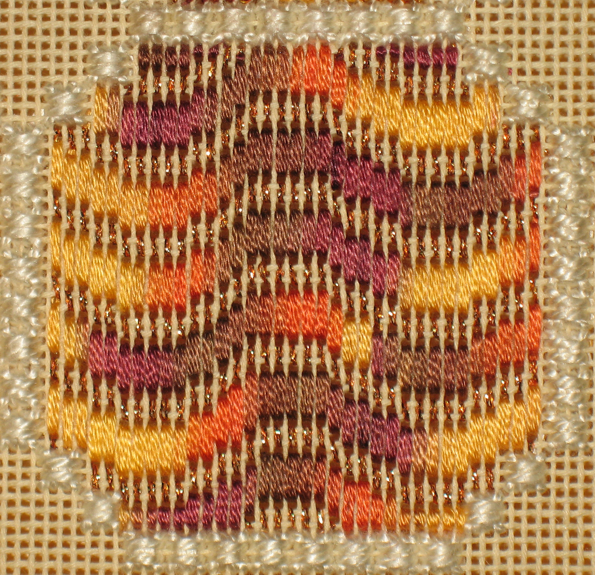 Octagon N combines Double Straight Cross (bottom left portion) & Alternating Cashmere (top right portion). I did the centermost row of Double Straight Crosses in Kreinik & filament & added couched filament to accentuate the flow of the Alternating Cashmere.