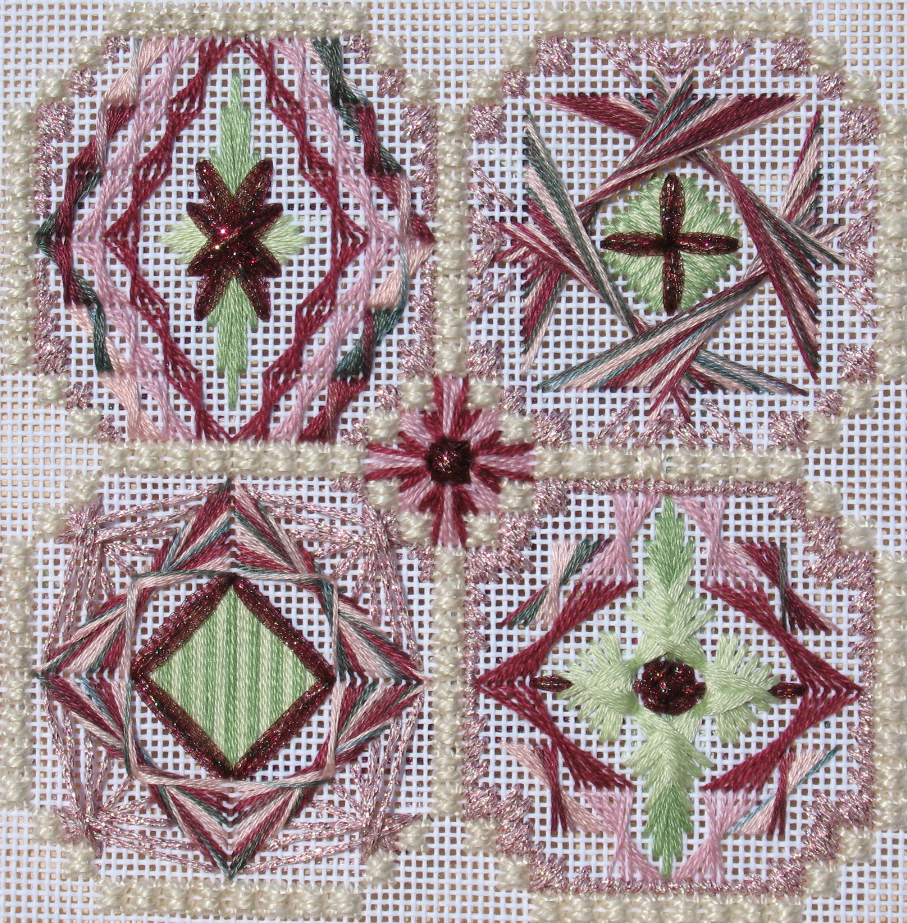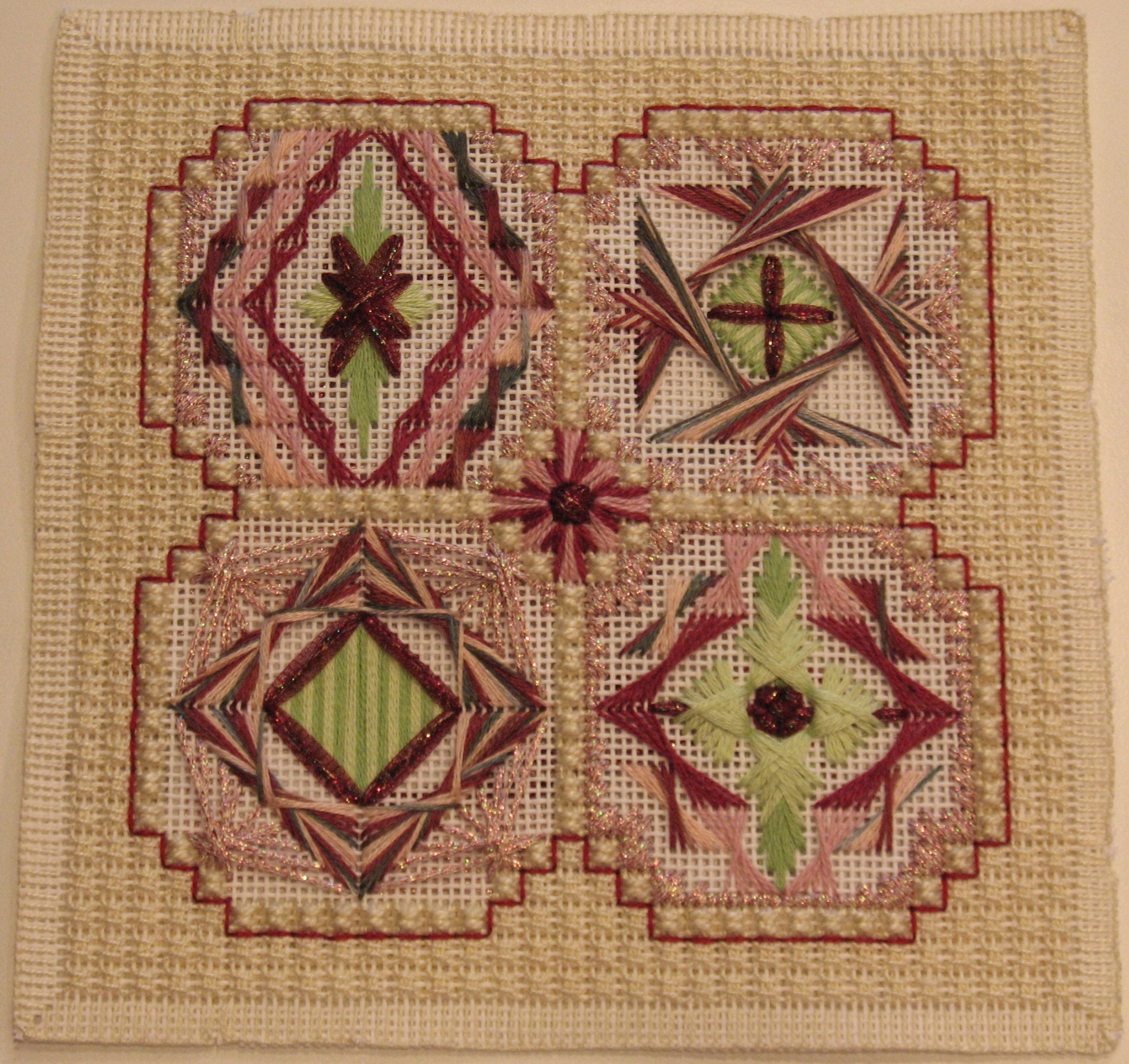 Octagon X (upper left) is Rhodes Stitch Variations, Octagon Y (upper right) is Walneto Stitch Variation, Octagon T (bottom left) combines Spratshead with center diamond, & Octagon V (bottom right) combines Byzantine & Rhodes Variation. I added Kreinik around the edges in various patterns.