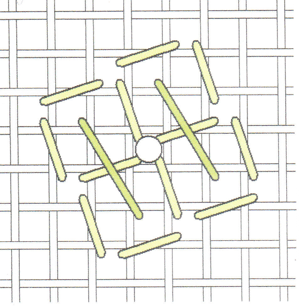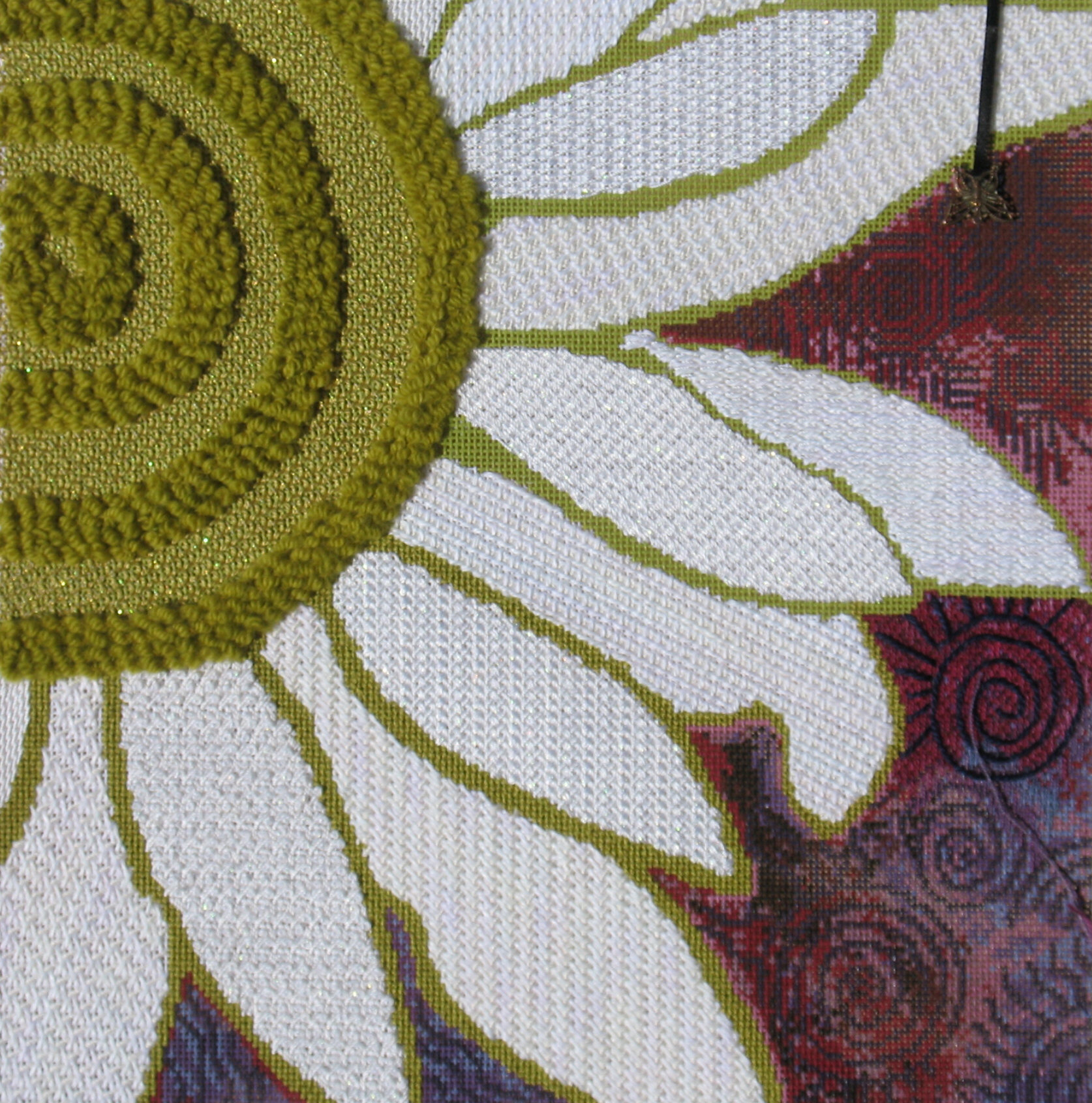 I selected this painted canvas at Fireside Stitchery in Frazer, PA for a David McCaskill workshop. The piece is actually called ‘Daisy’ and is designed by Paula Manning for Dream House Ventures, Inc. But, I thought it was a sun until David said it was a flower! Thus, it is named “Sun Flower”. David picked the threads and created mostly free-style stitch patterns for the piece.