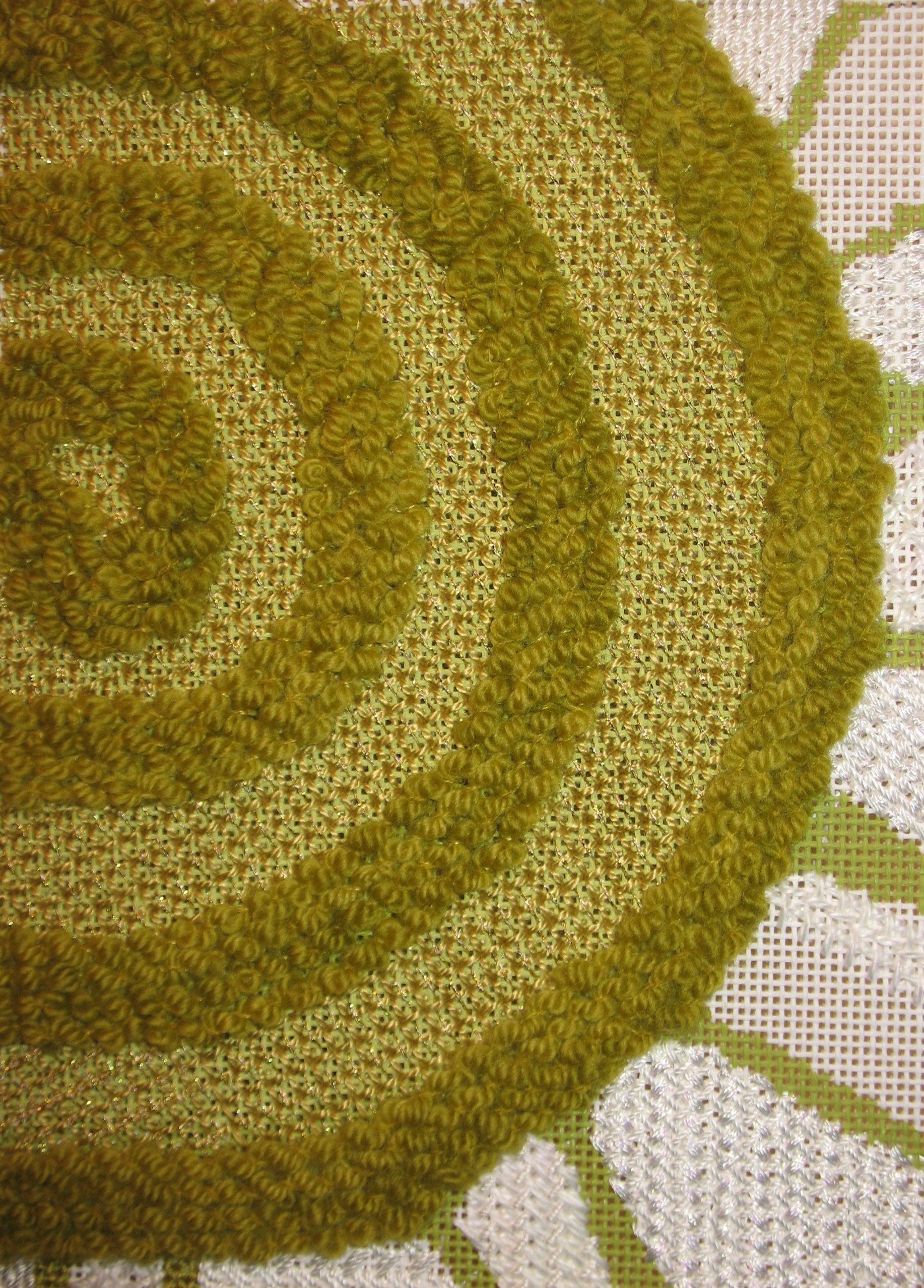 The dark green area used Wild Hairs couched with Anchor floss. The light green area used DMC #5 Cotton Perle and Kreinik Very Fine #4 braid for the sparkle.