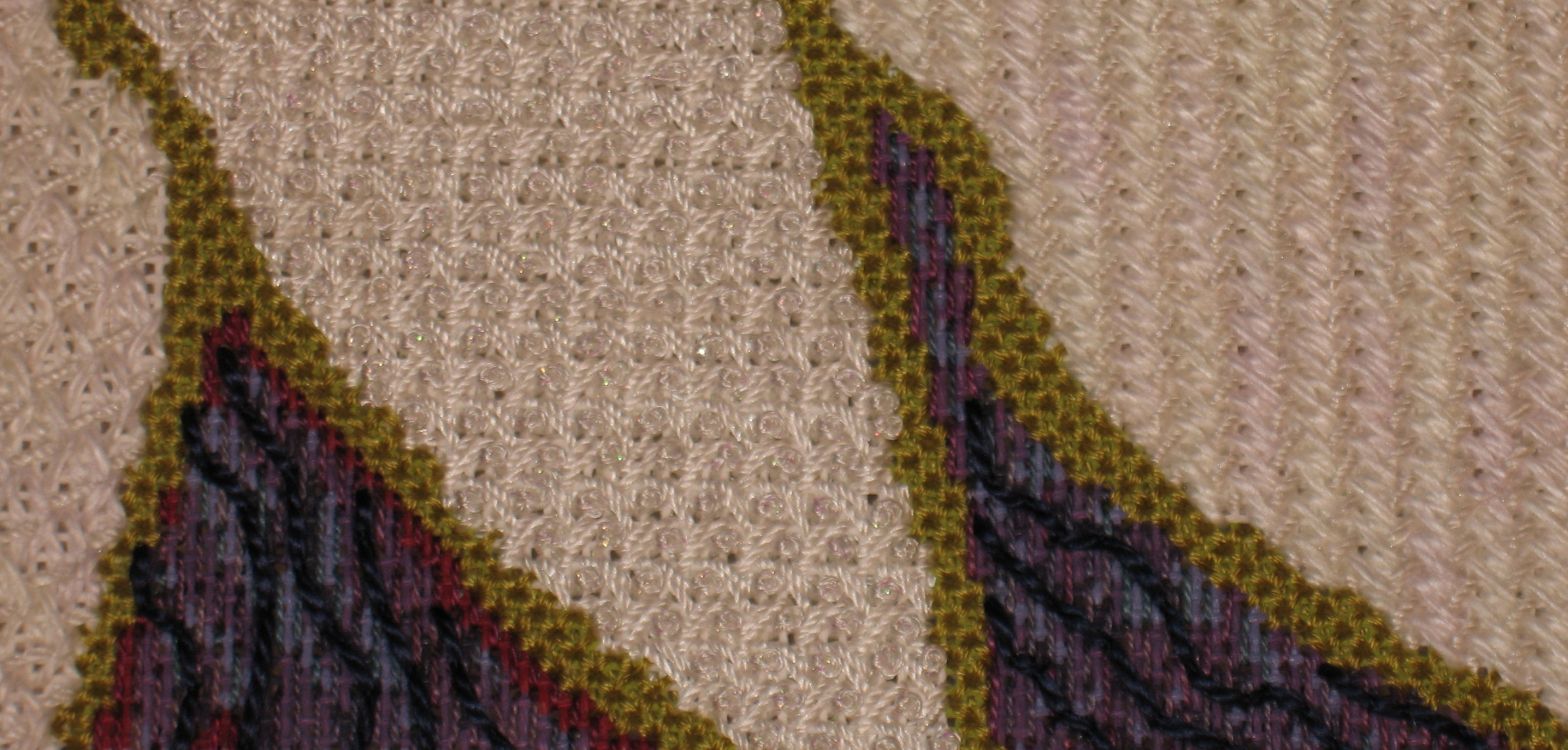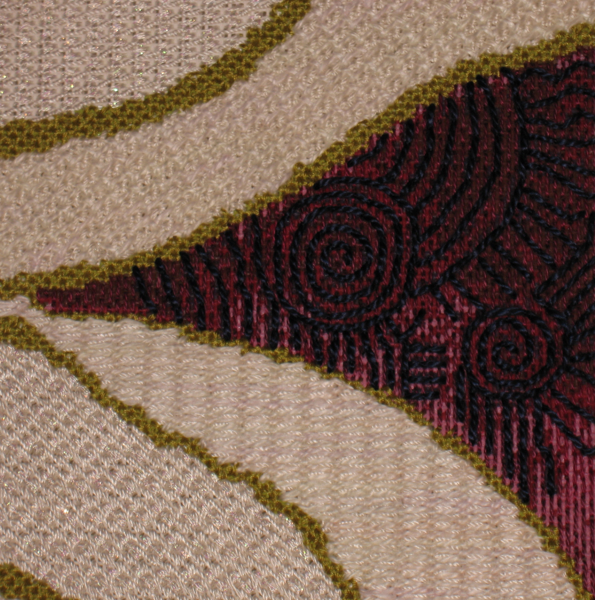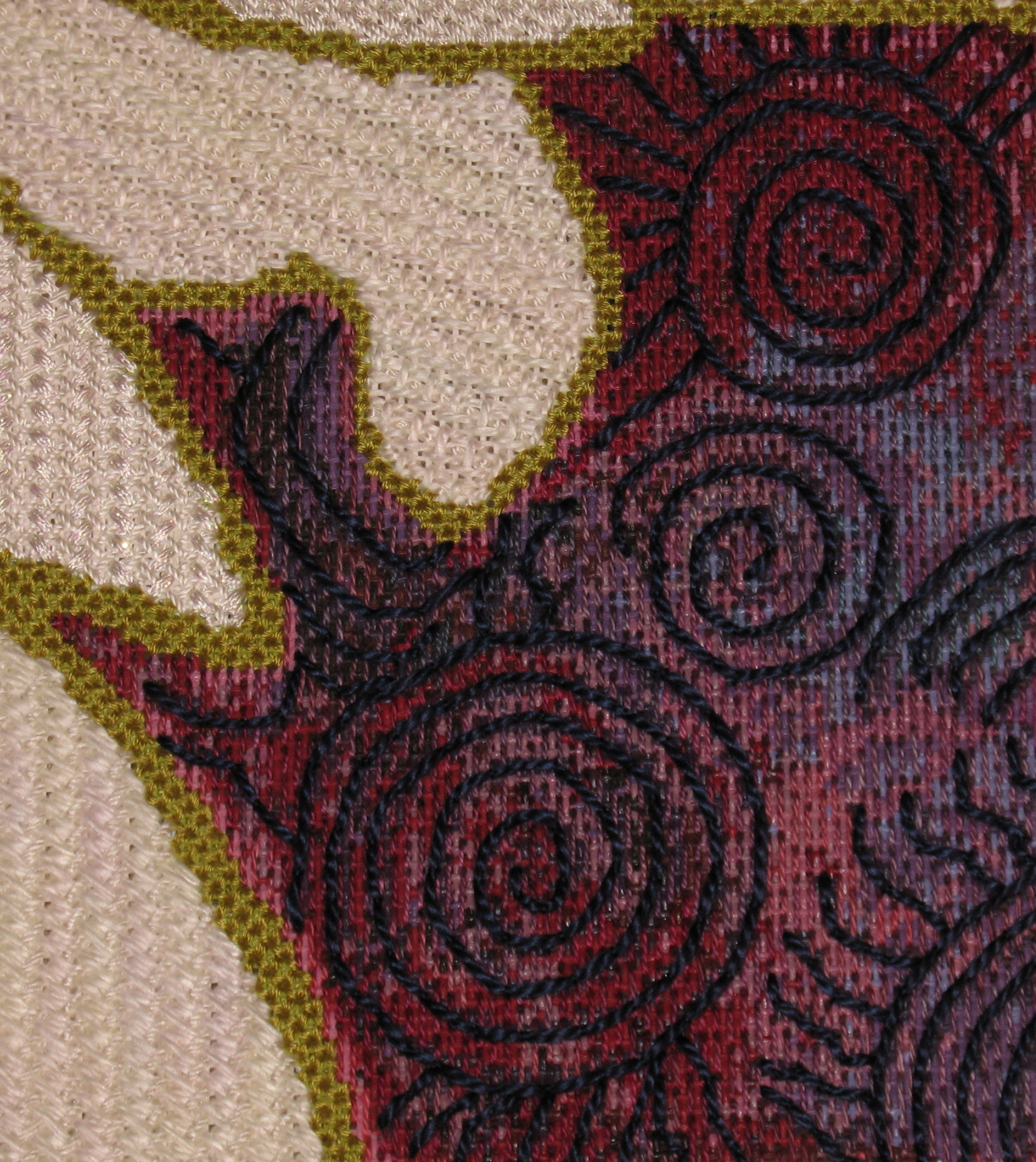 The abstract area used 3 Wildflowers with DMC Cotton Perle #5 couched on with matching DMC floss. The Wildflowers, rather than the Watercolours, is thin enough to allow the canvas to show through. Because I matched portions of the overdyed thread to the canvas as much as possible, I found this area of the piece particularly challenging.