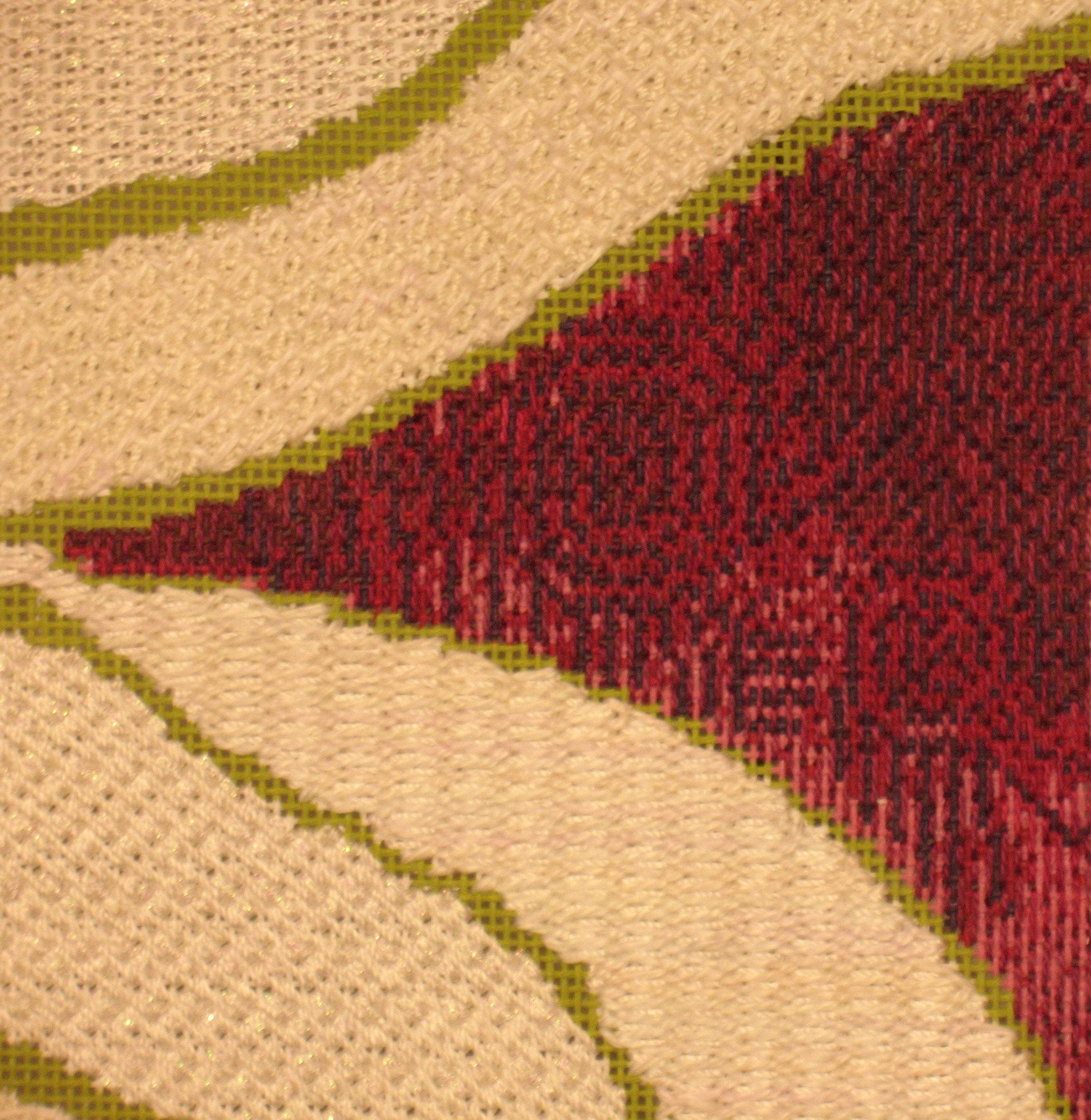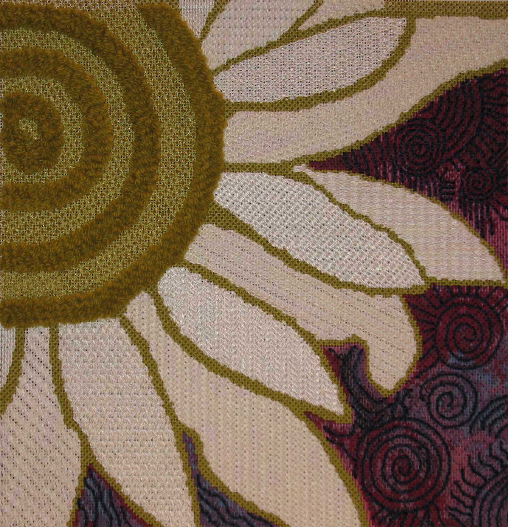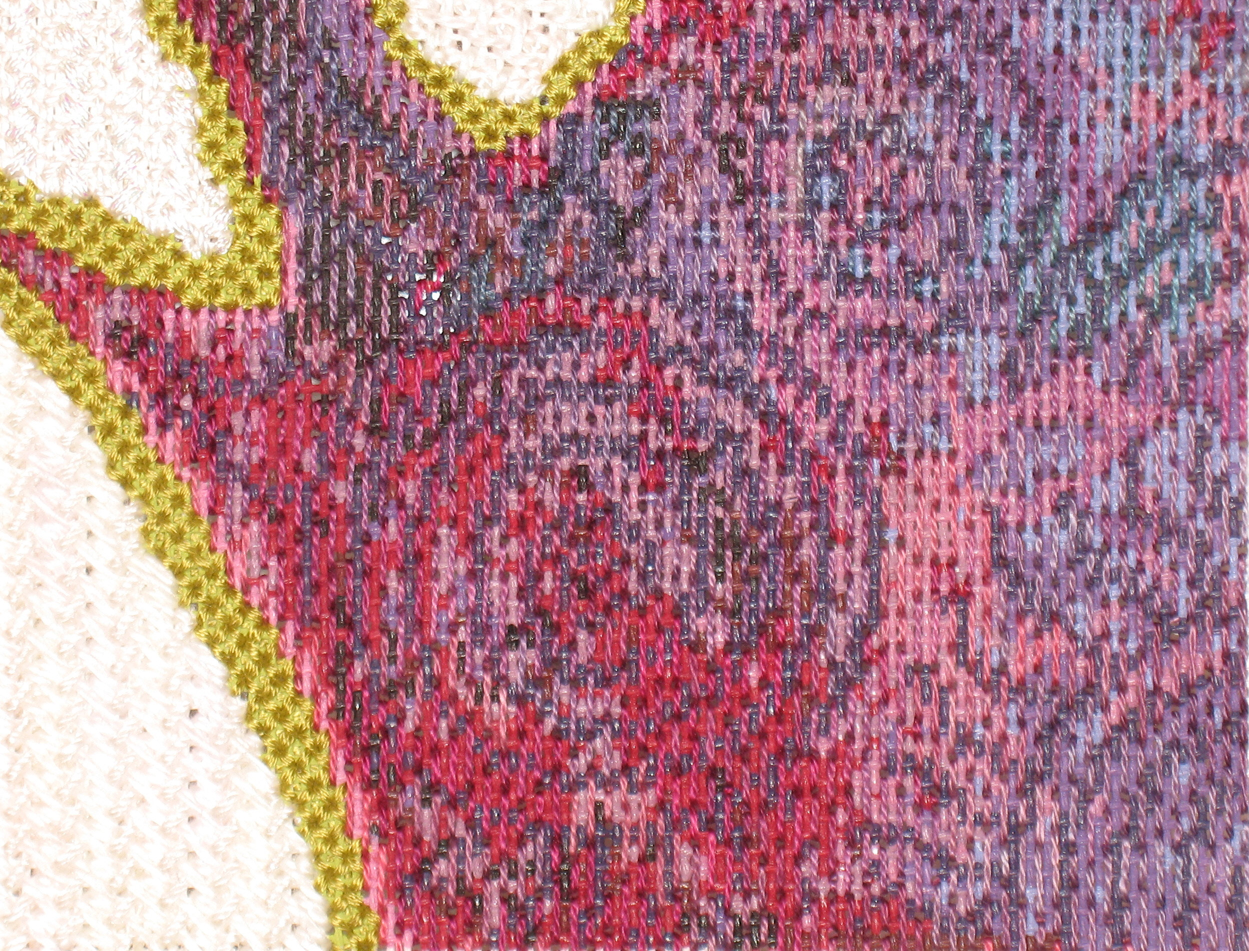 The abstract area used 3 Wildflowers with DMC Cotton Perle #5 couched on with matching DMC floss. The Wildflowers, rather than the Watercolours, is thin enough to allow the canvas to show through. Because I matched portions of the overdyed thread to the canvas as much as possible, I found this area of the piece particularly challenging.