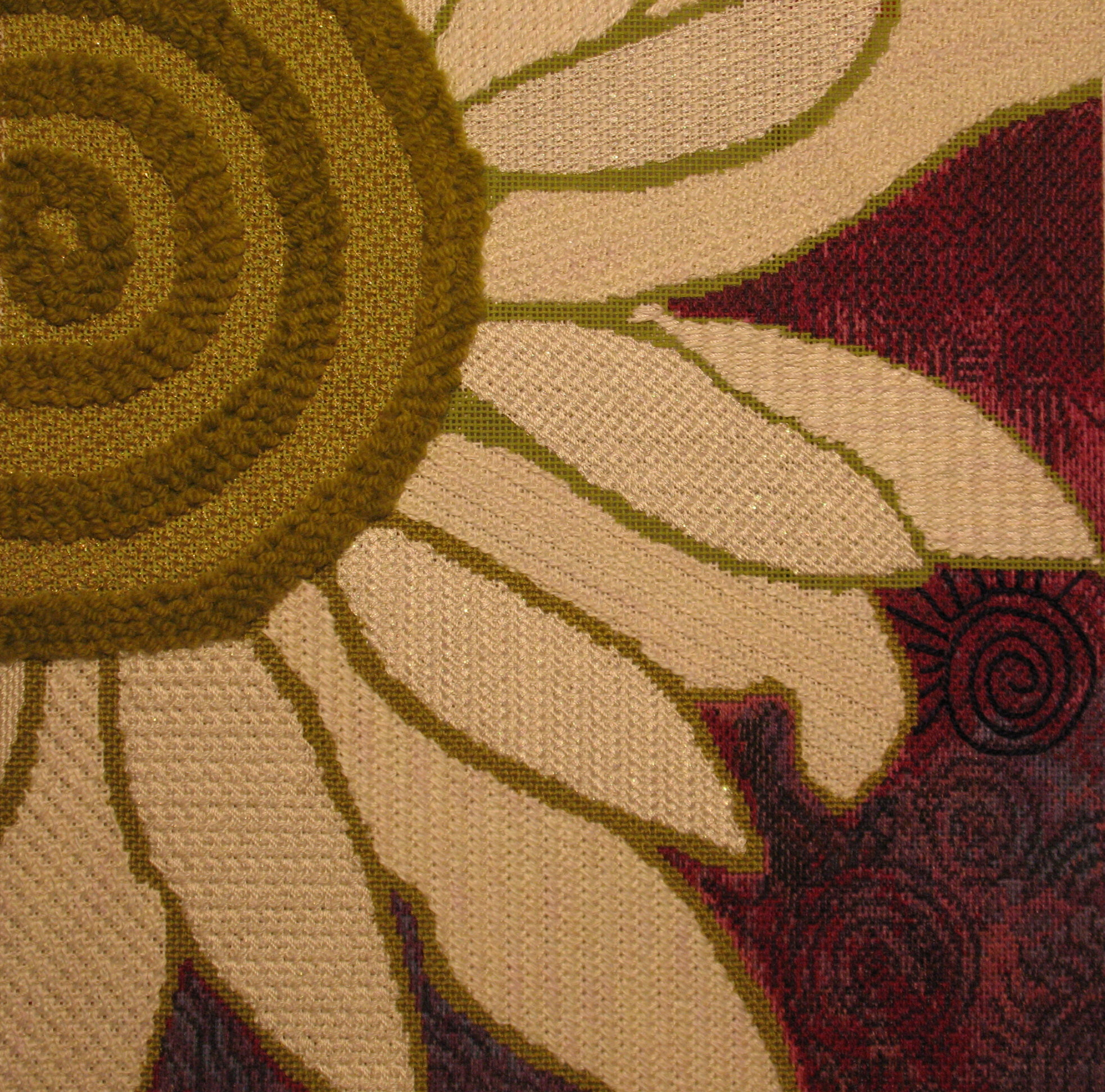 “Sun Flower” was entered in the 2010 ANG Seminar in the Painted Design with Stitch Guide category. For this piece, the judges noted that the twist of the thread was lost in some sections, a comment I got for certain areas on several pieces & something I’ll have to work on. And, the French knots were too big in one of the lower petals, making it a focal point. Looking at the overall % of total points allowed in this category, it scored only slightly lower than “Madam Carina” and got nice comments such as “fun to look at” and “an outstanding piece of needlepoint”. My artist’s statement follows: