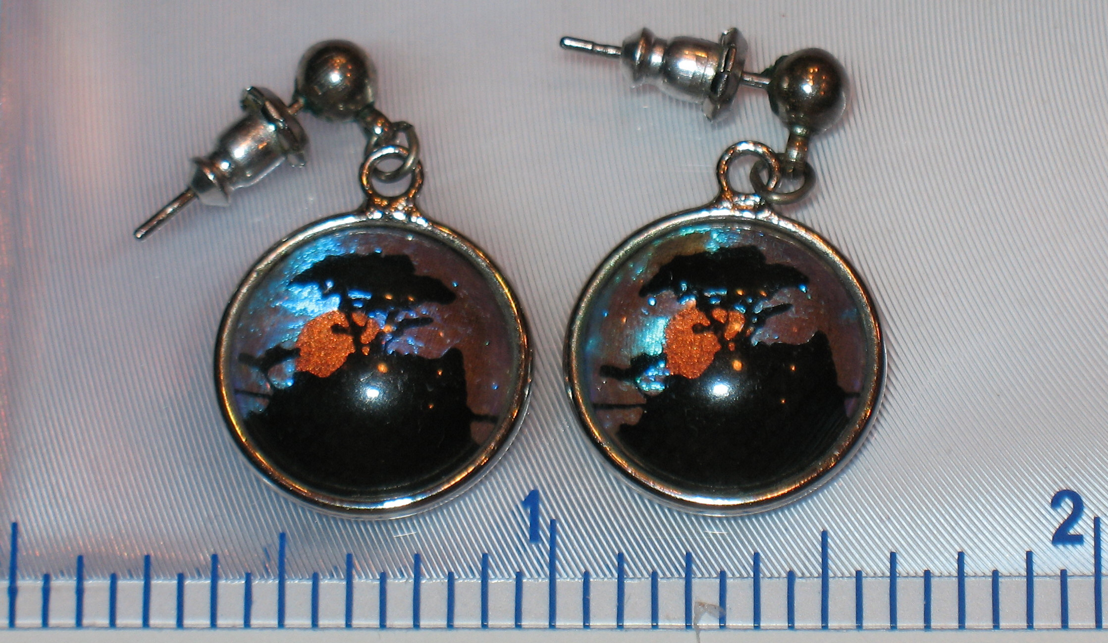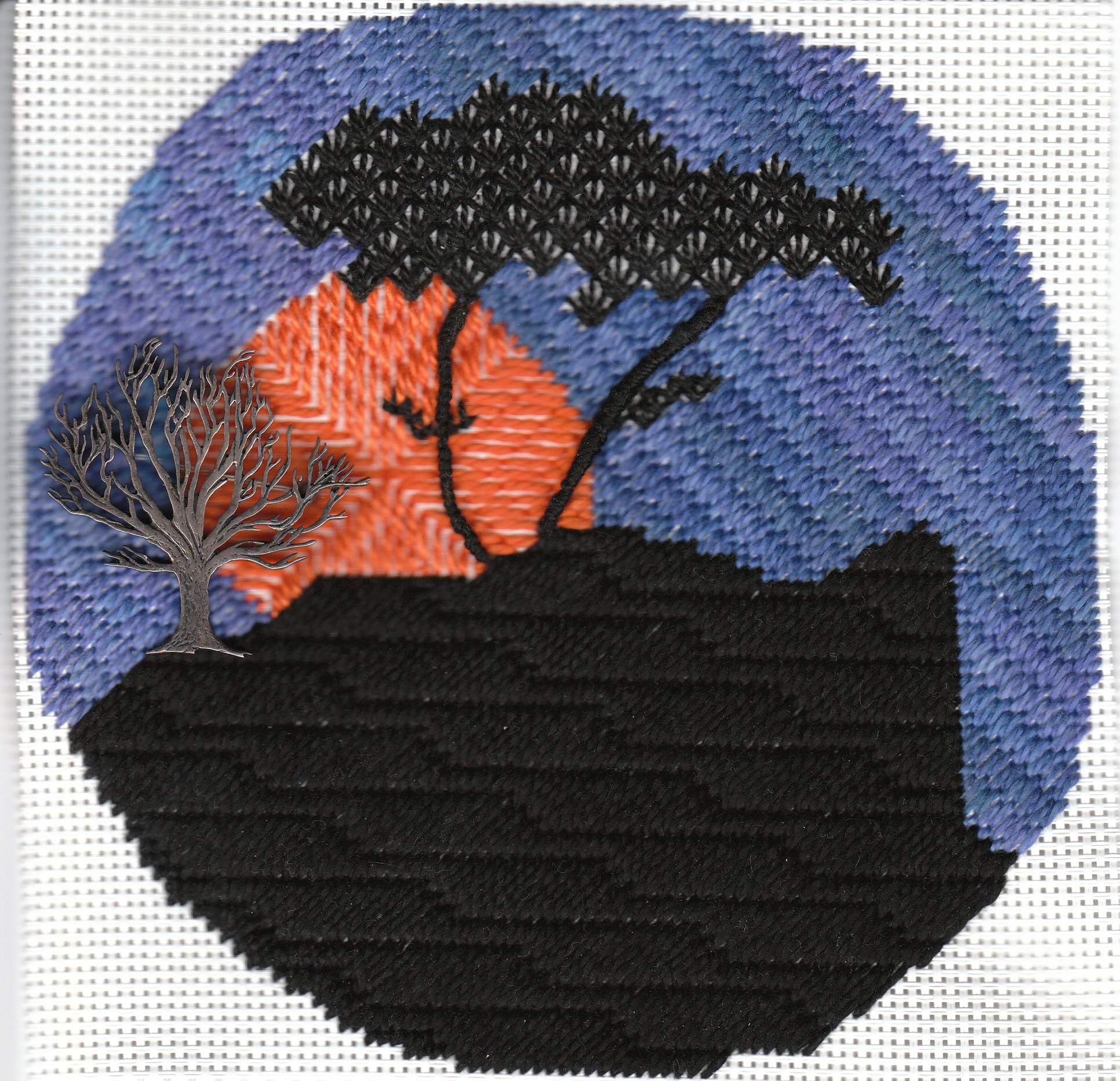 I didn’t actually “finish” this one – probably because I’d like to make the overall size larger & more round. I would also like to redo it though & improve on the sun. I think a different stitch would look better. But, I am very happy with the black rock stitch which is Bunger (from The Needlepoint Book by Jo Ippolito Christensen). The leaf stitch works well for the tree. And, the overdyed Watercolors is nice for the sky. The pin is perfect for the piece. I love it when stuff comes together like they were meant to – the earring, the pin, & the stitches. So far, this is one of my favorites.
