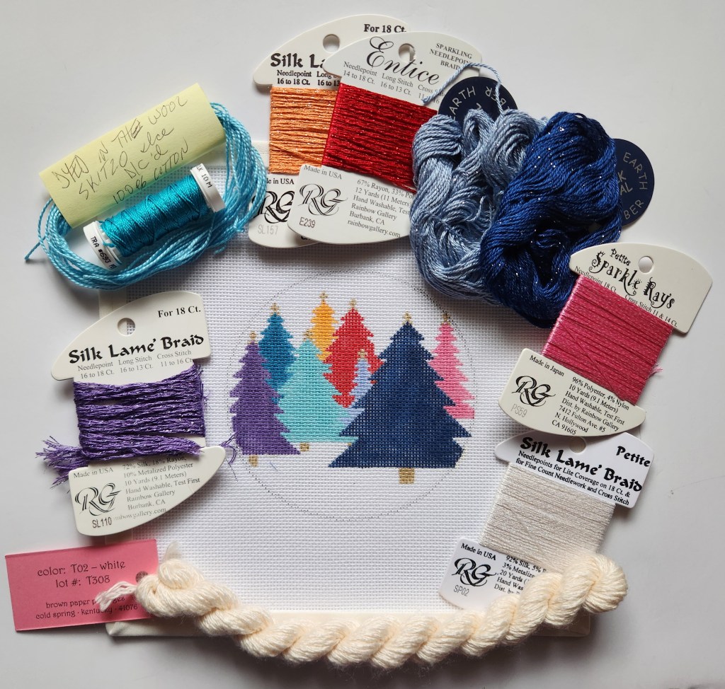 During the Stitch-in, I will be working on Colorful Forest (SS050) by Stitch Style Needlepoint. The stitch guide is by Jinny Barney McAuliffe. I picked it up at Greystone Needlepoint earlier this year. It’s a perfect project for a holiday Stitch-in! I kitted it from my stash.