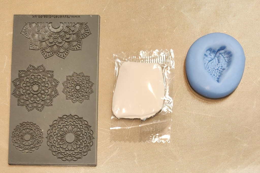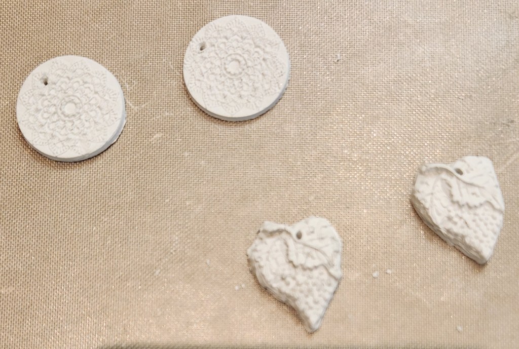 The clay gets pressed into the molds. Then, you pop it out of the mold. I used a cookie cutter-like piece to cut out the round pair and a different tool to carve around the other. Besides Michele describing the process, the longest part of class is going through her molds to find what you want. She has hundreds of them.