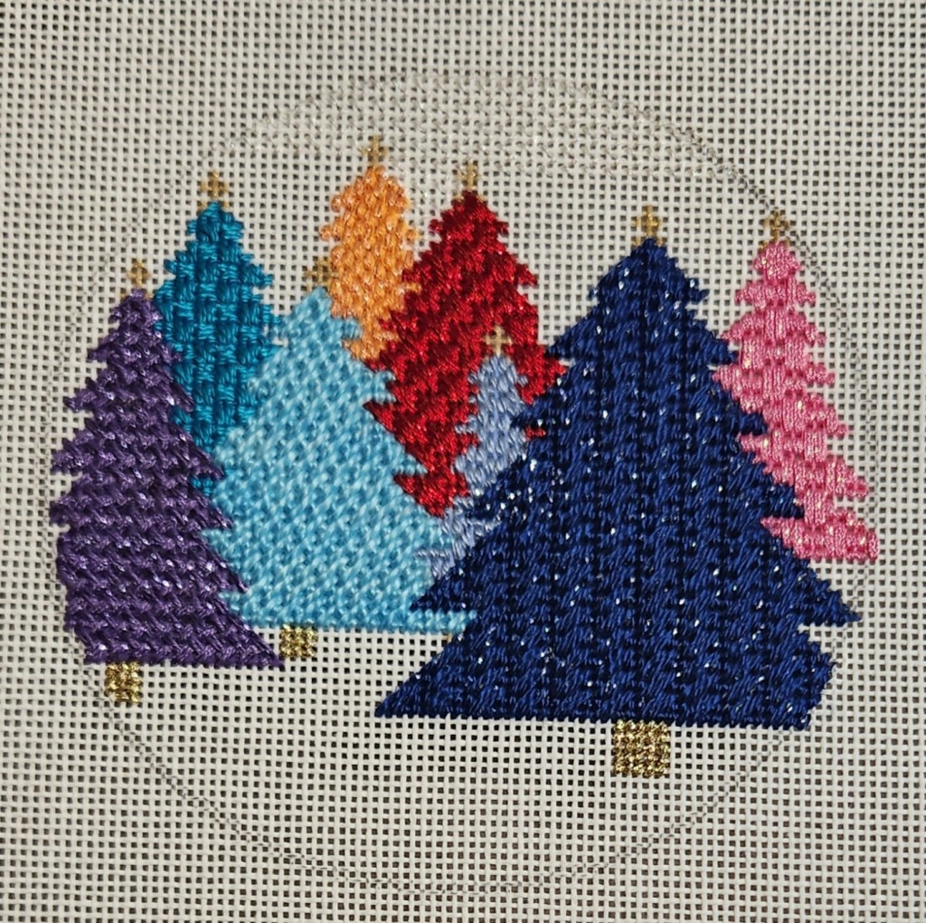 Despite the time spent in 2 classes, looking at other people’s pieces, chatting, and shopping, I did finish the trees, trunks, and part of the sky of Colorful Forest during the Stitch-in. Although the stitches came in the stitch guide, I didn’t quite follow it completely correctly. Nobody would know except me, Buff, Cindy, and Janet because they were there when I realized what happened. Starting at 10 am without my full cup of coffee caused me to miss that the stitch guide writer, Jenny Barney McAuliffe, started stitching the back trees first instead of from left to right which is how I started. No harm done (2 trees swapped stitches). And, the last stitch on the dark blue tree was supposed to be a double reverse Nobuko but doesn’t reverse here. And, I am fine with that too because that gives both blue trees a vertical effect.