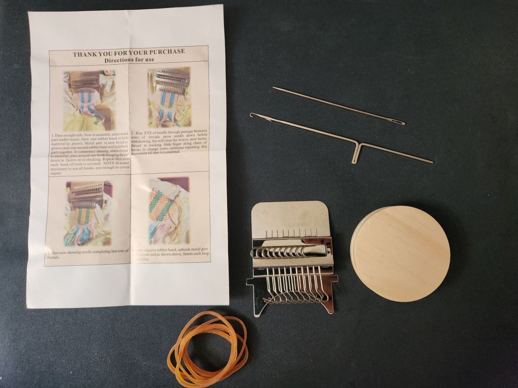 My sister gave me this darning Loom for me to have fun with. It’s similar to the one that I have, but the long metal piece with the hook on the end is quite a mystery. It is called a loom pick tool. But that’s as far as I got on YouTube and the internet. Why is the metal sticking out near the middle? The needle is nice and long. It’s very handy as I don’t have one anywhere near as long as that one. Between readers of my blog and folks at the Needlework and Textile Guild of Media, I am sure I’ll get some help. I think the loom brand is Quirzx Darning Loom Speedweve Type Weave Tool.