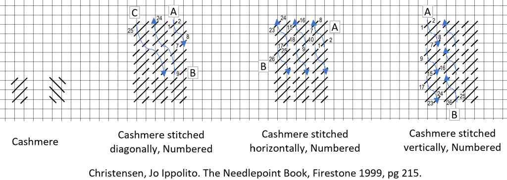 • The direction of a stitch can be changed. In one color, the front of the canvas will look the same but done in two different colors or an overdyed thread, there will be differences.