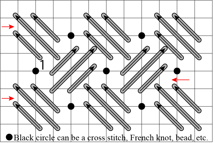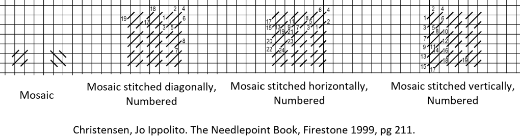 • Stitches are worked opposite of the direction you are moving (to get the proper pull). If a diagonal stitch is worked bottom left to upper right, then work towards the left. If a diagonal stitch is worked bottom right to upper left, then work towards the right.