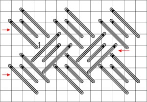 • Direction of a stitch creates a different effect (water on a lake is typically horizontal; river flowing down a hill with a gradual slope probably has stitches at angles of 30° or less; a waterfall with a steep slope probably has vertical stitches or are 60° or more).