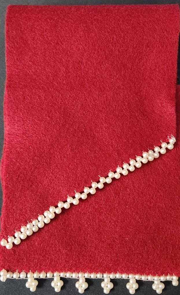 Karen taught us how to bead a felt purse. Her favorite book on the topic is Fine Embellishment Techniques by Jane Conlon. She has taken a few plain shirts and added beads around the neck to dress them up. Very nicely done. Karen usually attaches them with a single strand of polyester sewing thread because it’s stronger than cotton. She has used invisible thread but finds it difficult to see. I hear that!! She puts the shirts in the washer, no special care.