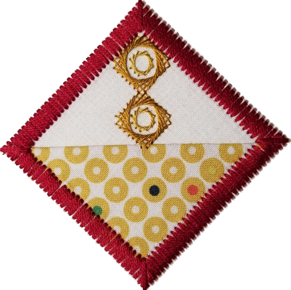 I came up with the second design to allow me the opportunity to practice the French Knot technique taught by Judy Jerow. I learned that all felt is not created equal. I had to switch to a denser felt because the French Knots were sinking into the fluffier felt. Her French Knots are the tiniest! I used Wildflowers 027 Lemon N Lime for the flower. And, I wanted to try a scalloped buttonhole described by Mary Corbet (https://www.needlenthread.com/2013/04/stitch-fun-scalloped-buttonholed-chain-stitch.html). For that, I used Wildflowers 066 Jade. Very nice effect.
