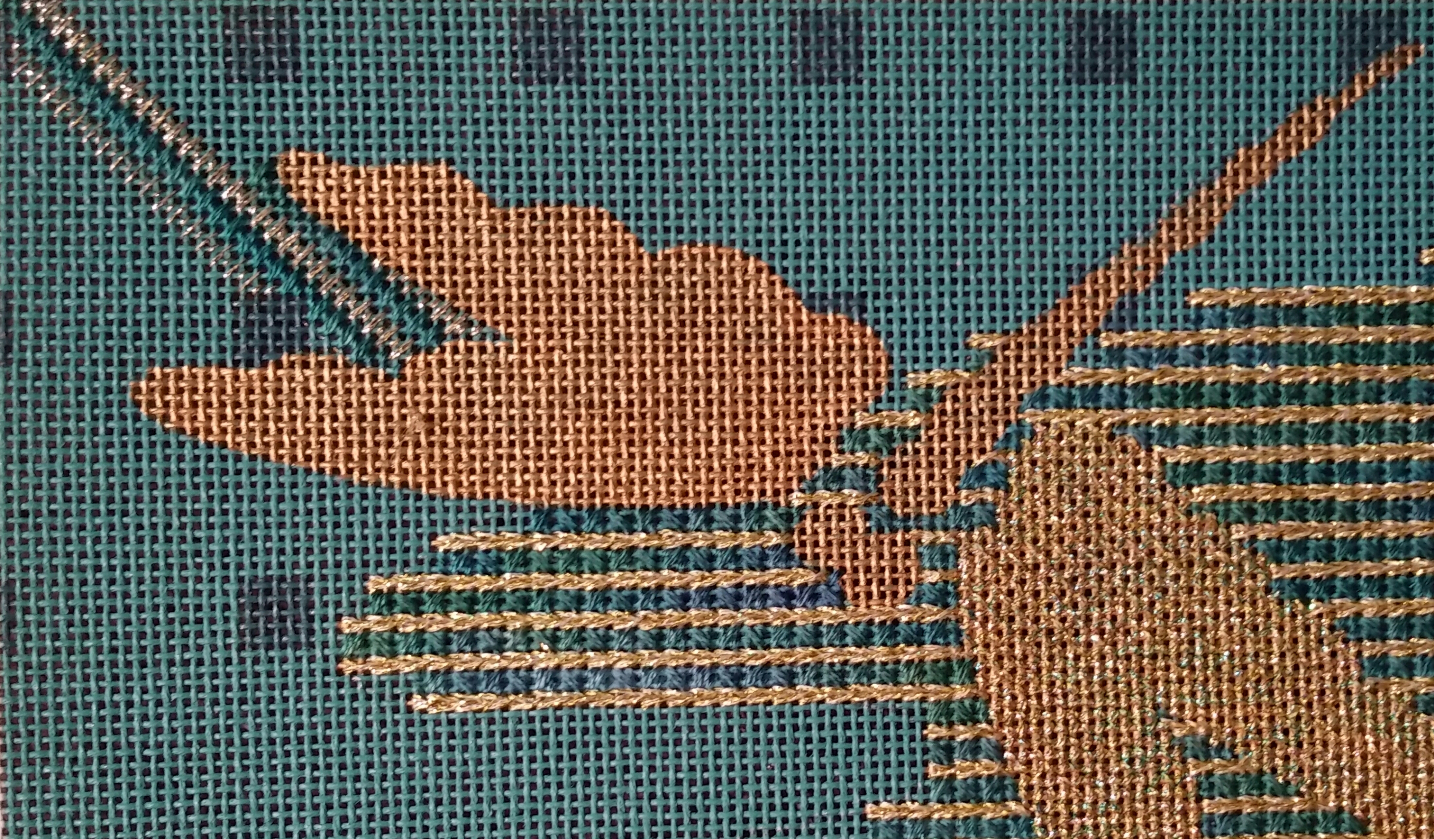 The wings were Alicia’s Lace (#8 045) outlined with Gold Rush (202C) & couched with Accentuate (024).