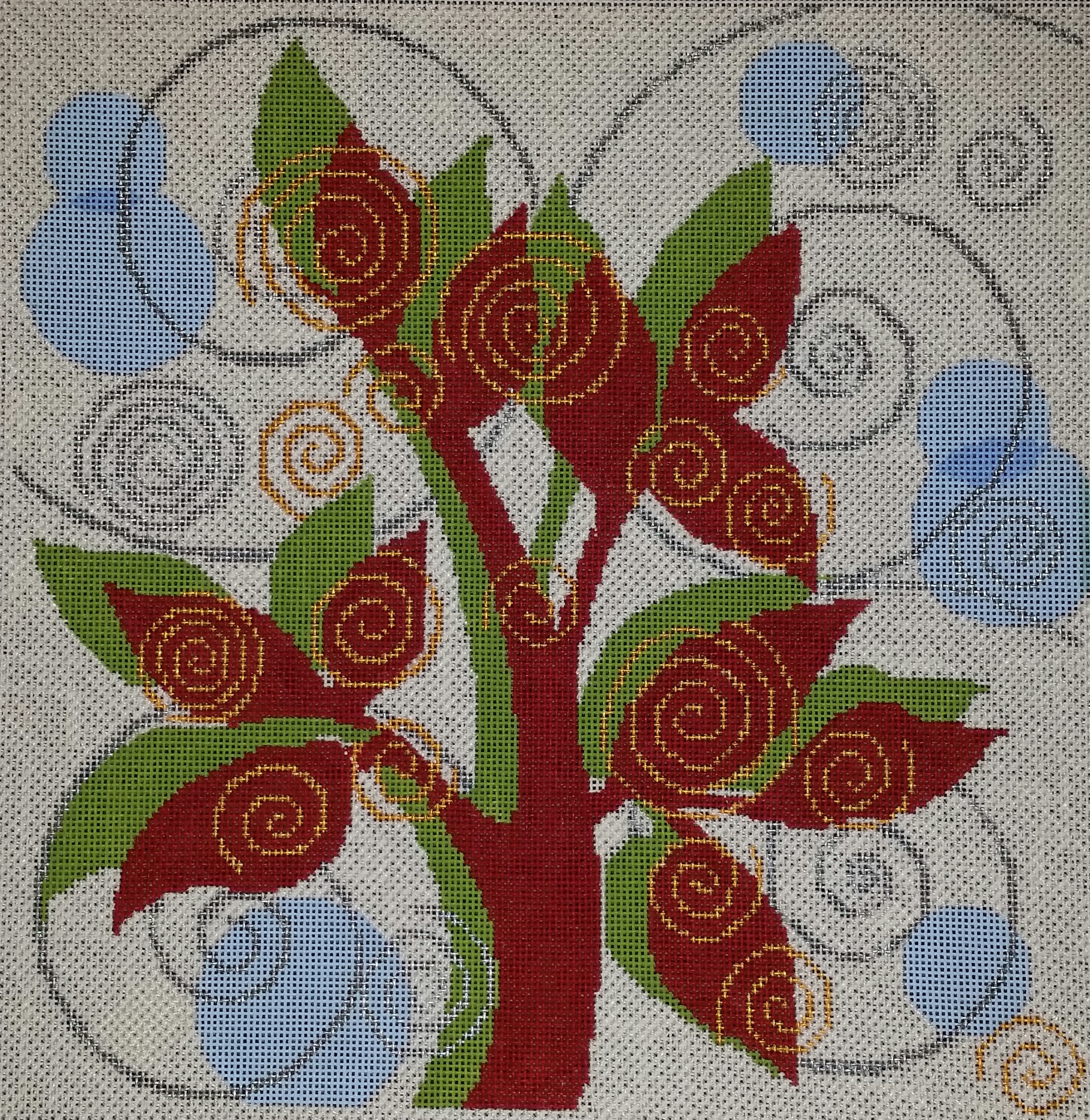 Next up for Swirling Leaves was the blue bubbles which are also in the background. Janet Perry, NAPA Needlepoint during an online class, recommended a couple of options that would serve to bump up the glitz (from the white background) for the bubbles. So, I went with Silk Lame Braid Petite SP98 for the light blue area and a darker Silk Lame Braid Petite SP151 where the bubbles overlap.