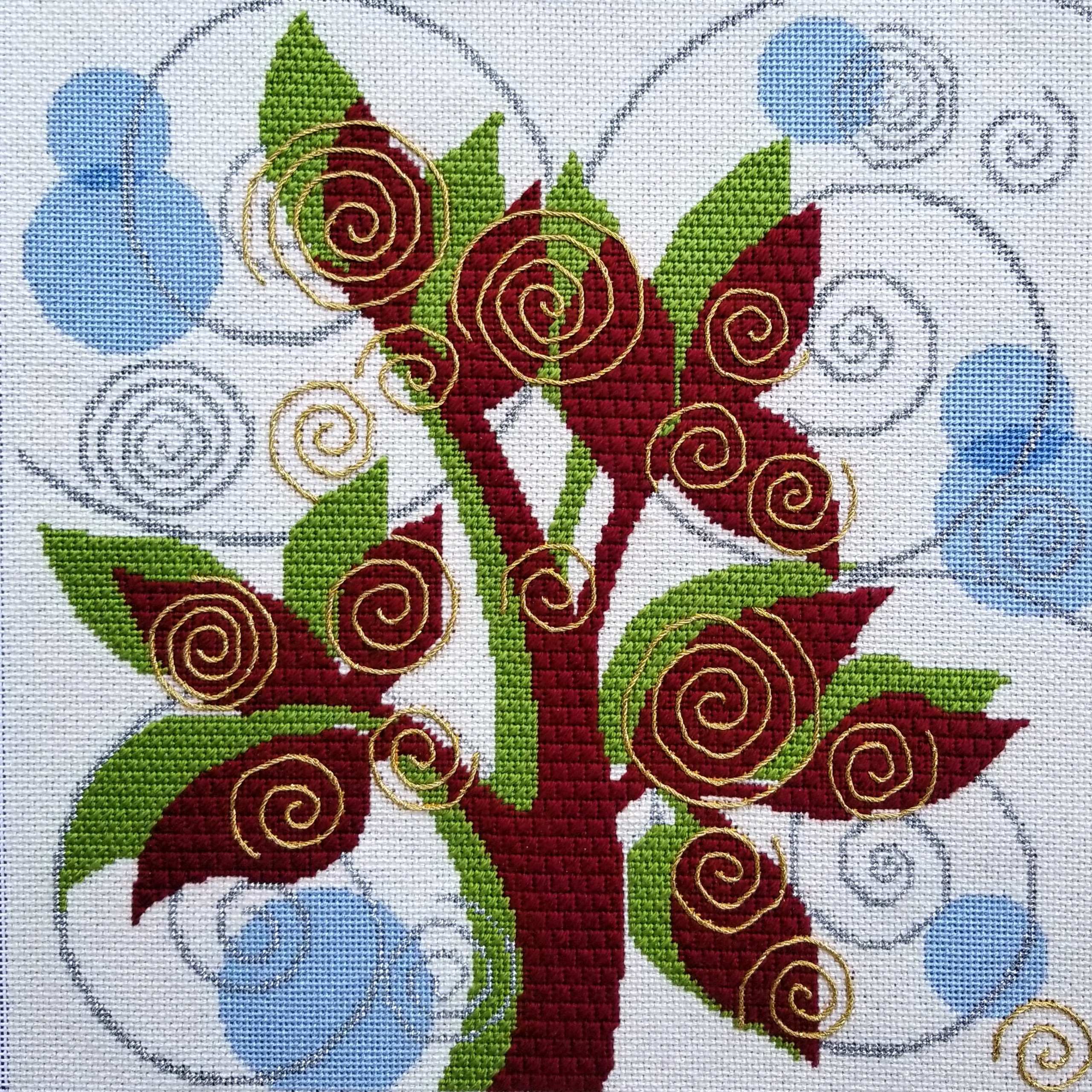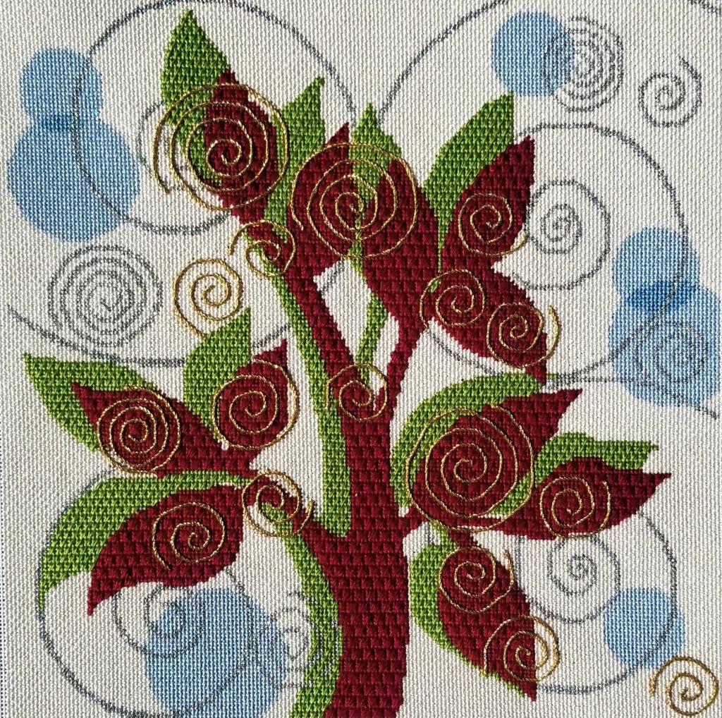 IN 2015, I took Janet Perry’s cyber class about learning to create your own stitch guide. I submitted a picture of a design which she chose for one of the class discussions. It’s Swirling Leaves (DH3825) an Elements canvas by Dream House Ventures Inc.