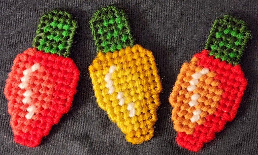 Thanks to my ANG Main Line Stitchers chapter Stitch-in on Saturday, Saturday night’s movie, and football on Sunday, here’s a couple of days’ work on the Christmas bulbs (7 count plastic canvas kit from last year). Three before the meeting, four during the meeting, and five after the meeting, which means half are done!