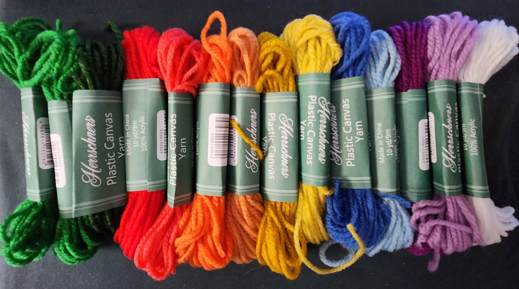 The kit came from Herrschners. It’s on 7 mesh plastic canvas and uses plastic canvas yarn (quite bulky; each skein is 10 yards). Very pretty colors.