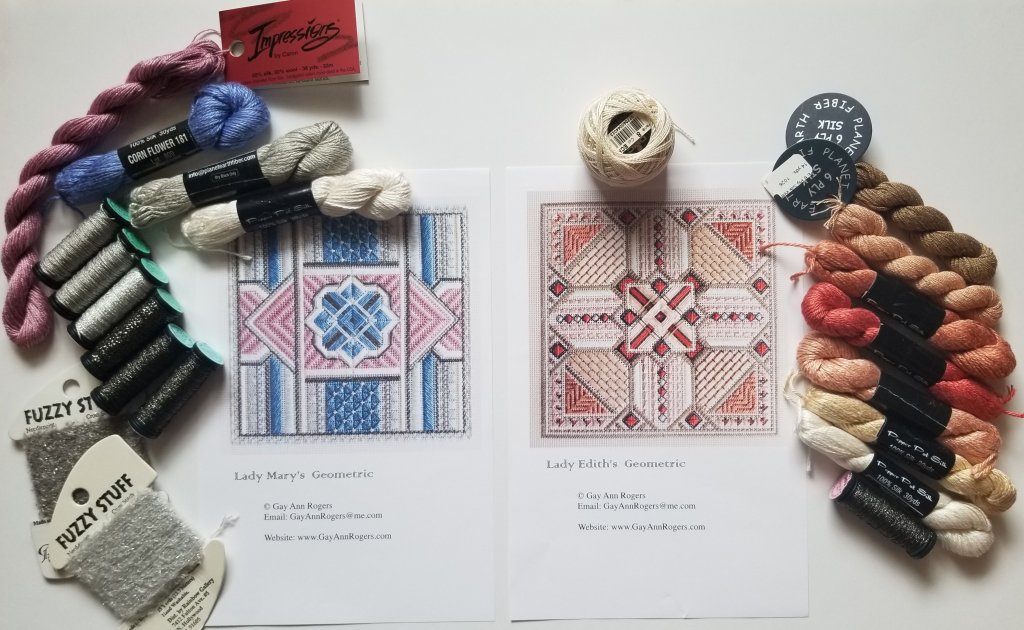 It took ordering from 3 stores to compile the required threads to stitch all 4 Gay Ann Roger’s Downton Abbey pieces. Everything including the 4 pieces of canvas are now ready to go. I only substituted Fuzzy Stuff which I had in my stash for the Planet Earth fiber Furr-Fuzz-Funn. One of the Kreinik colors has been discontinued but I was able to get it. I thought it was interesting that 3 of the 4 pieces use DMC Ecru and Lady Mary’s does not. Nothing as common as Ecru for her!
