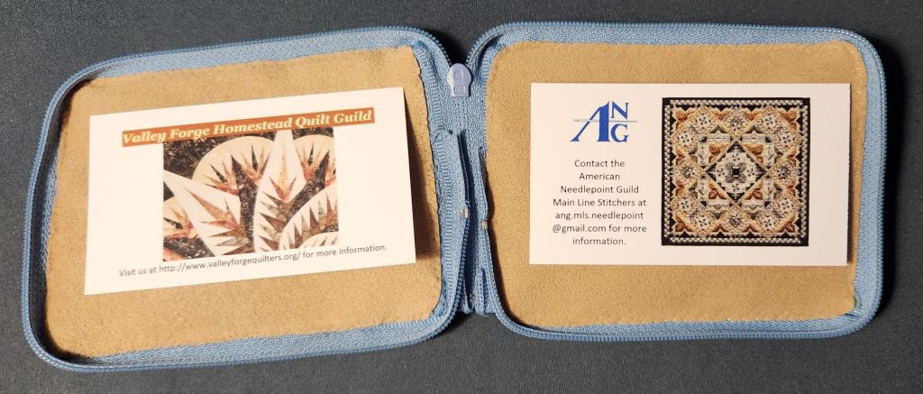 She can leave some at quilt stores to advertise her Valley Forge Quilt Guild and our ANG Main Line Stitches. The quilt is one of her award winners at this year’s exhibit. And, the needlepoint piece is her colorway for my design and the ANG 2024 Stitch of the Month, Crescent Journey. I think the neutral colorways look great together.