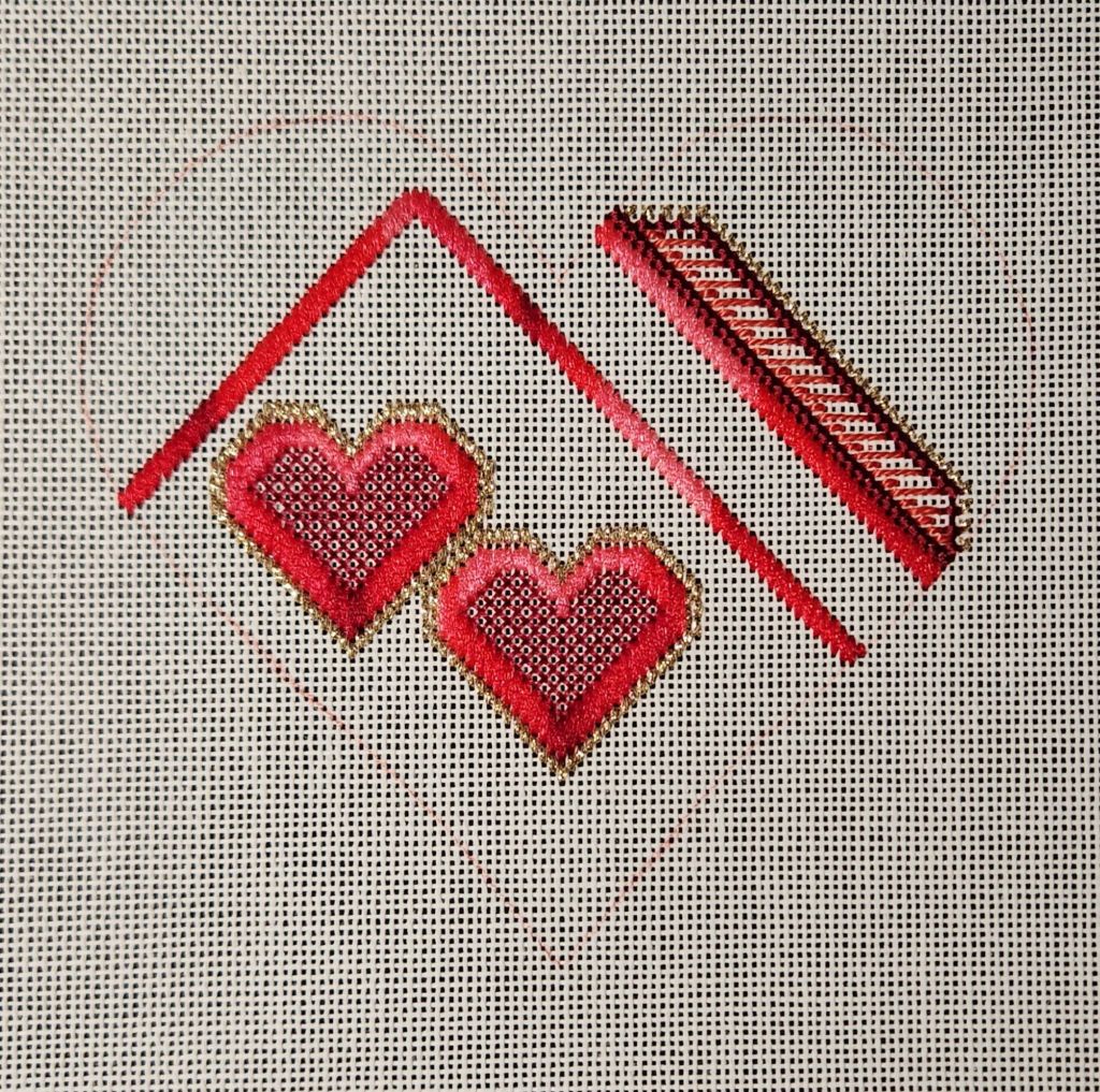 The overlay stitches were new for me. It took me 2 tries to get them right. I looked at the piece the following morning and thought 2 were wonky. After carefully looking, I realized that 2 were wrong one way and 2 were wrong a different way! The smaller Jessicas are 3×4, and the large ones are 5×4 (which was oddly difficult for me too-not sure why). So, the overlays are off center on the large one, which is what messed me up. But, I got it. Those eyelet holes had to be that big to get the threads to lay around the hole.