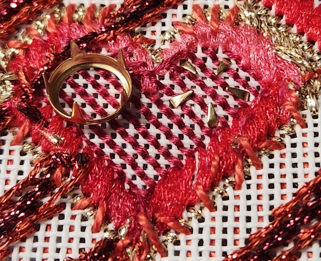 That left the beads and cabochons to add. I managed to break a bugle bead to squeeze it onto the bottom right row of them. It is still a tad long, but leaving it empty was glaring. Several of the rimsets are bent, and one bead package was missing them entirely. So, I’ve ordered more. Placing the prongs into holes is key to getting the top of the rims close enough to the canvas so that the cabochons aren’t loose.