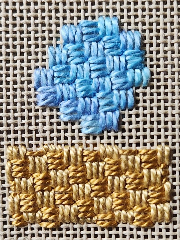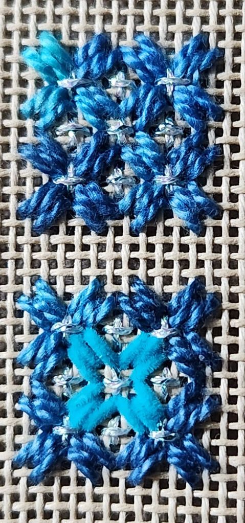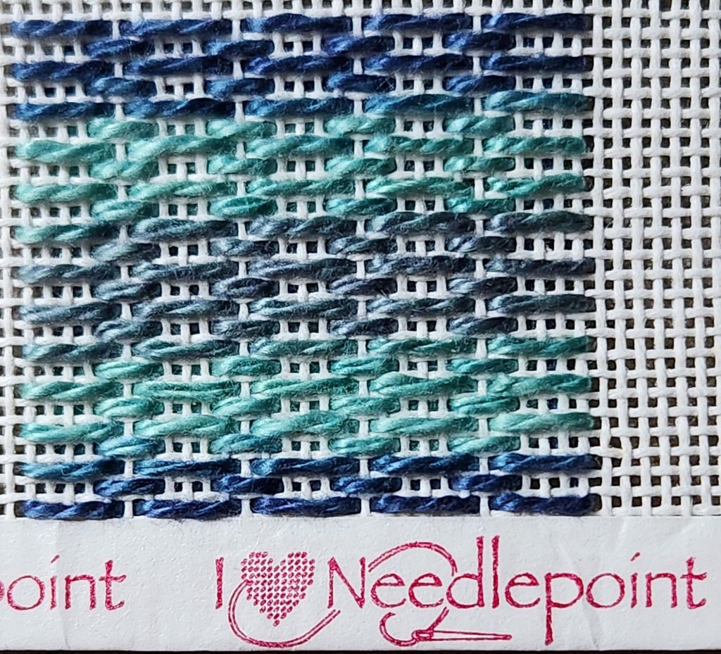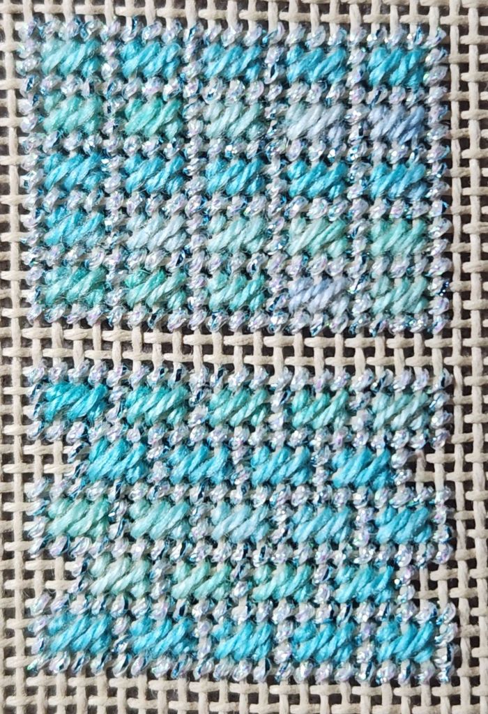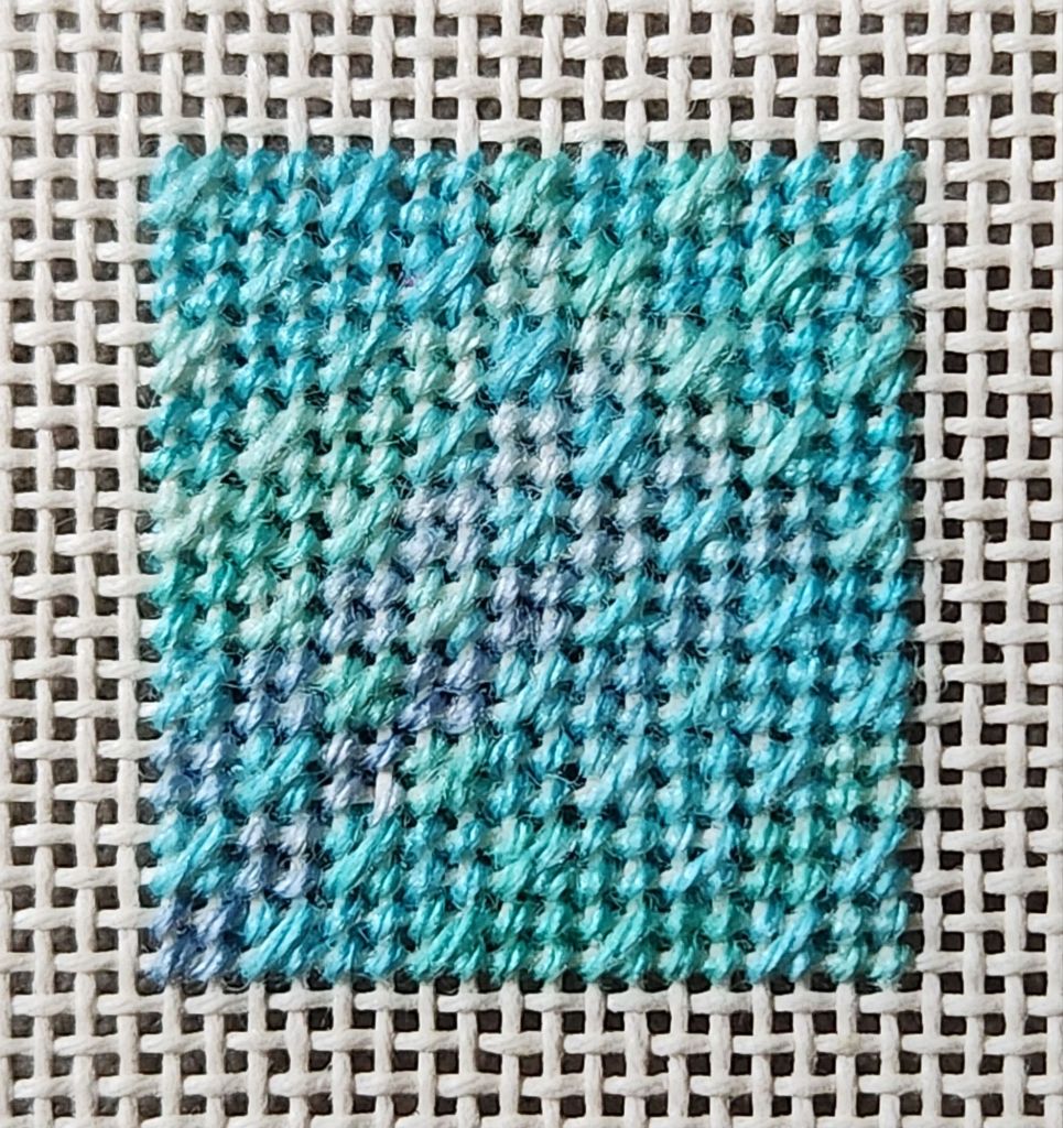 Here’s what 1 strand of Impressions 181 Ocean Breeze looks like. I worked the Mosaic stitches first and then filled in the tent stitches. It’s more striped than Checkerboard. Two different colors are needed to obtain the checkerboard appearance.
