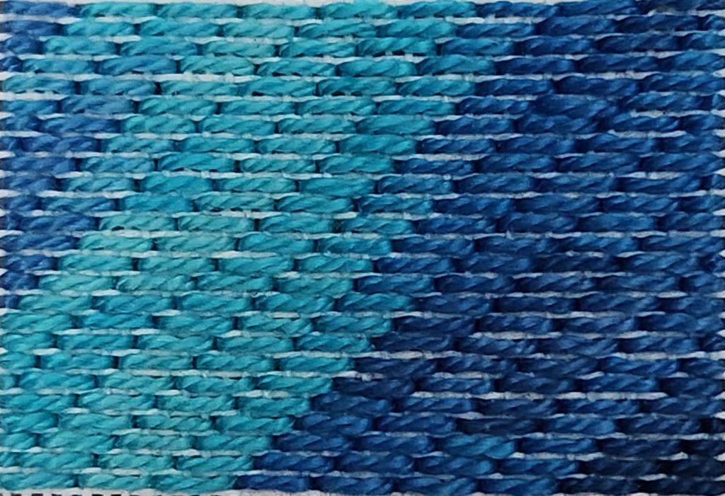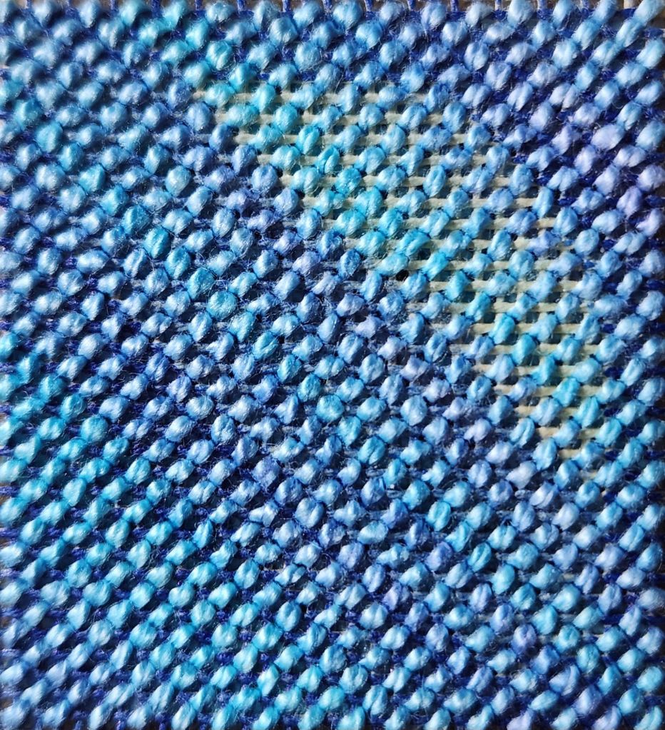 Playing with an old skein of Watercolours Mediterranean (hand written label and lot number but no item number) for today’s Horizontal Twill Stitch. I see an ocean and my husband sees a sky.