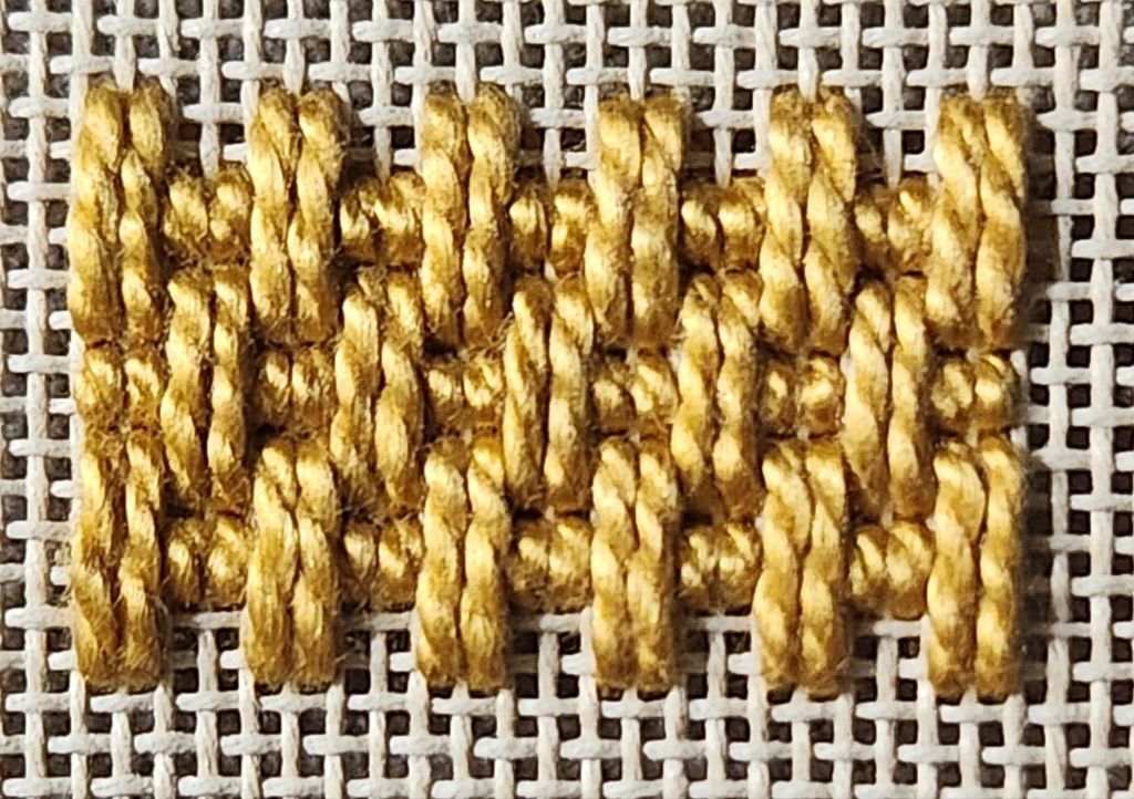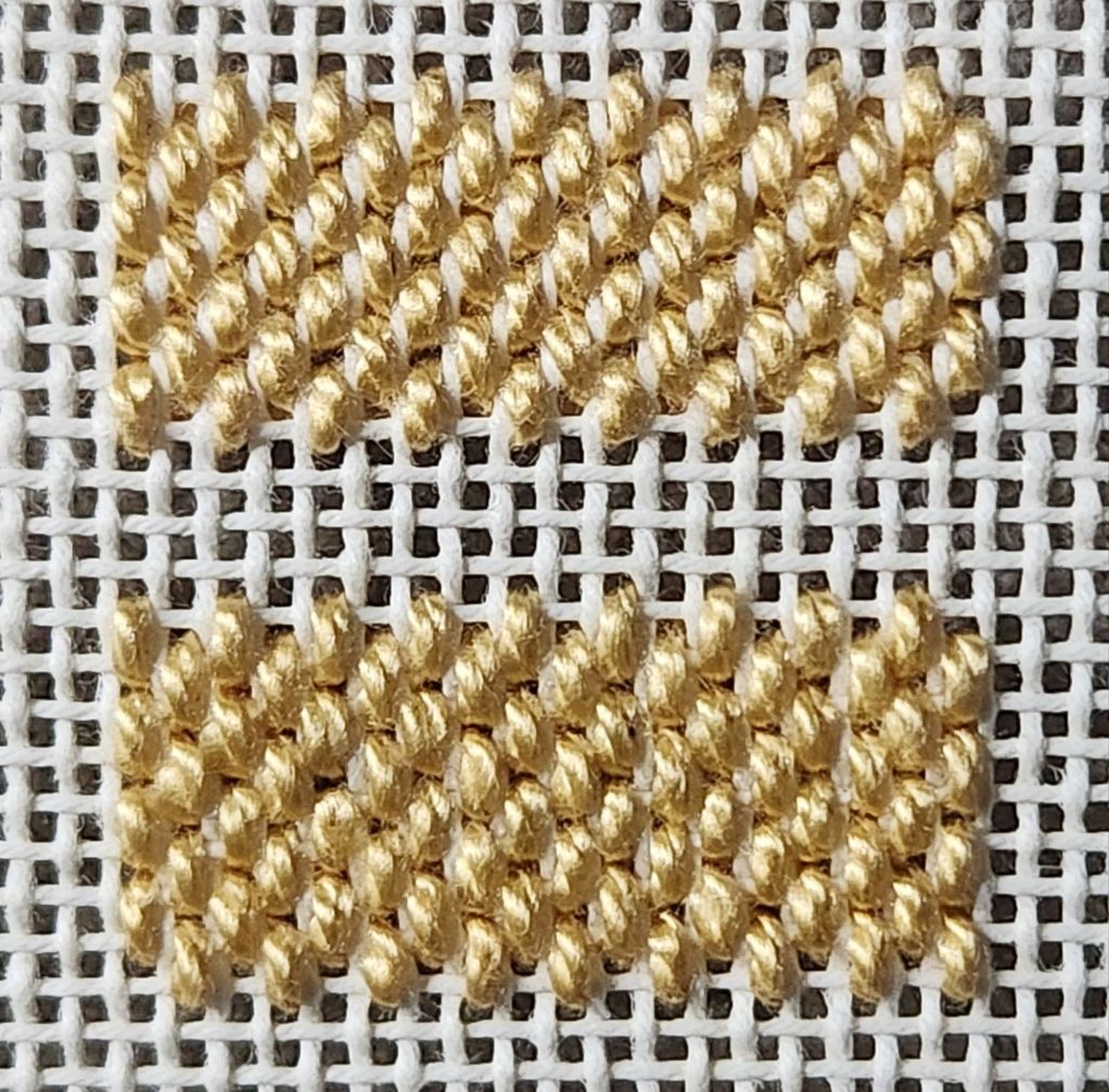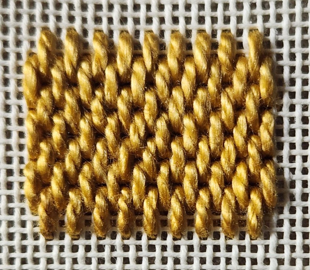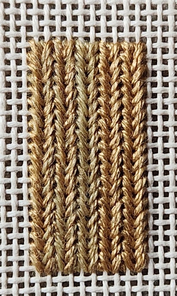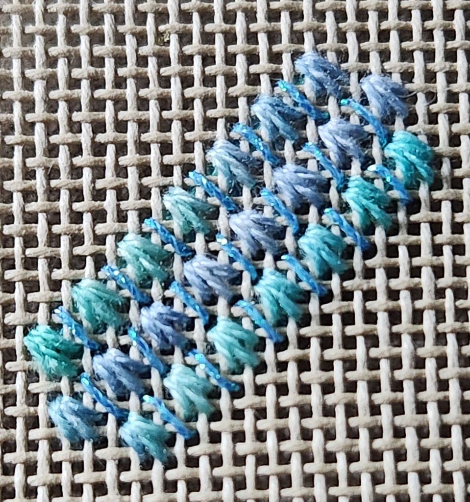 I used a 12 stranded Soie d’Alger without stranding it in this small sample. It feels more secure than the way I’ve stitched it previously. I only did a small sample. It’s not one of my favorites but useful when you need something fluffy.