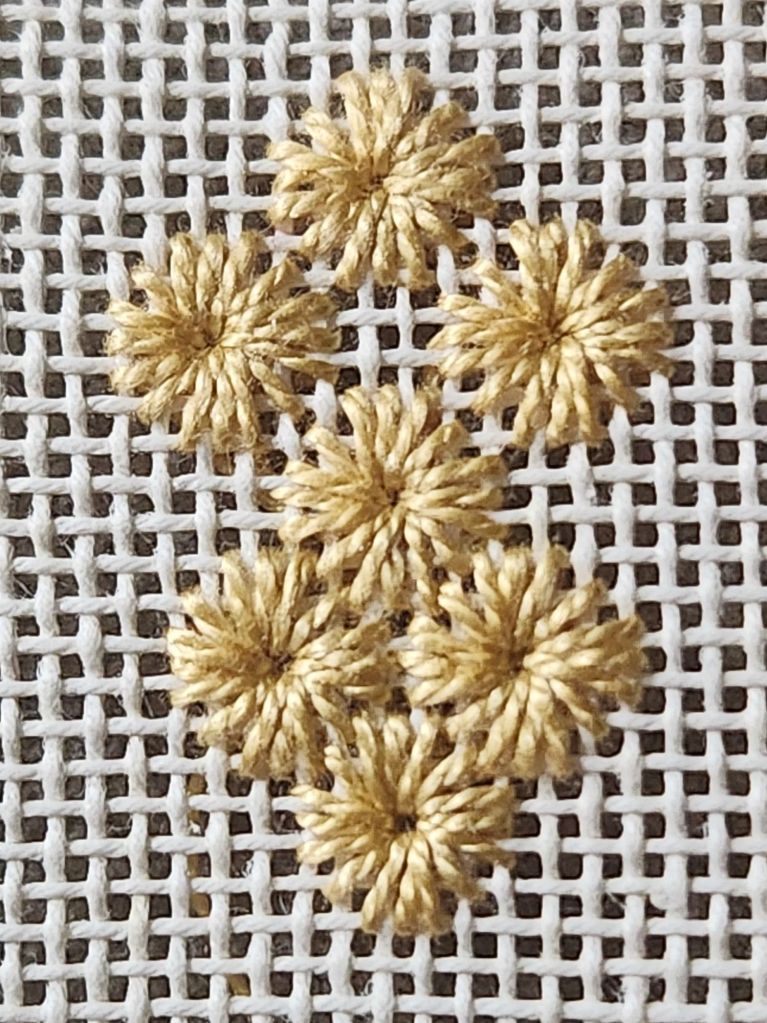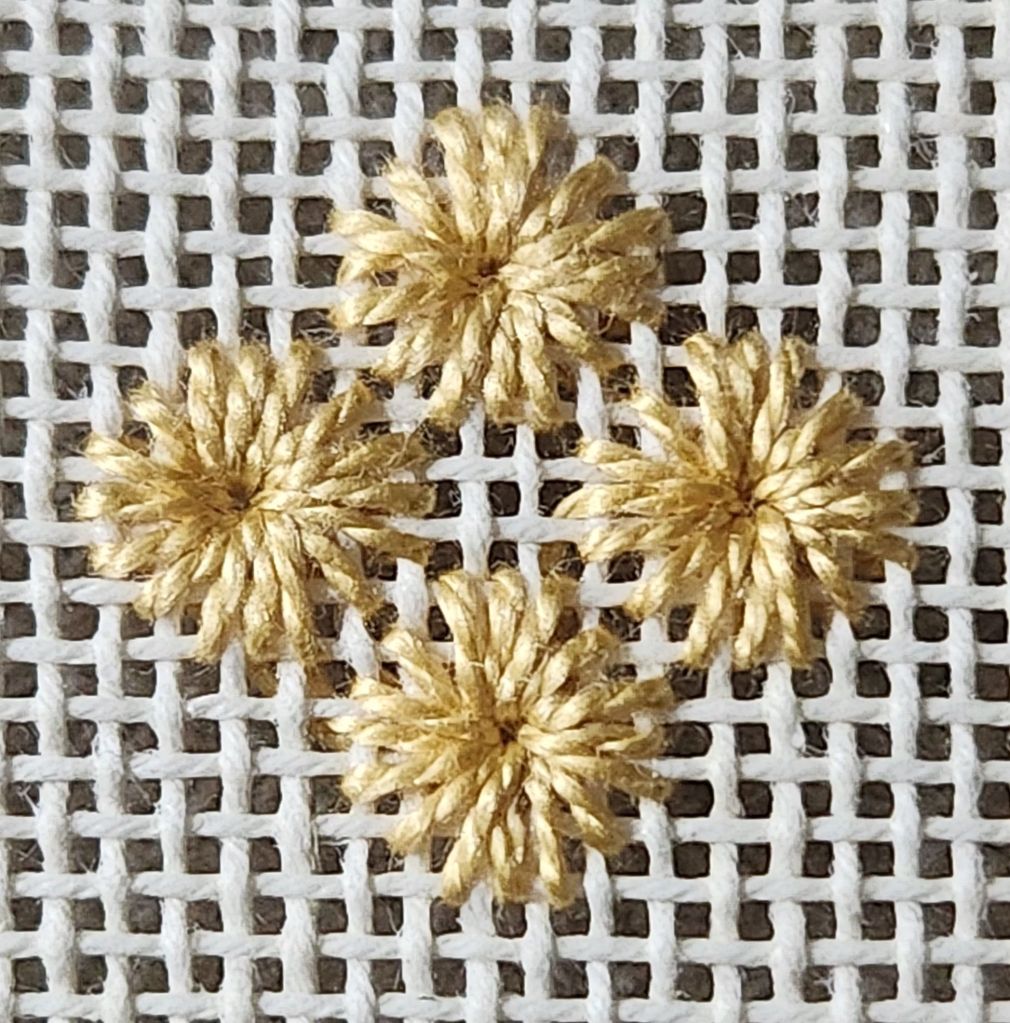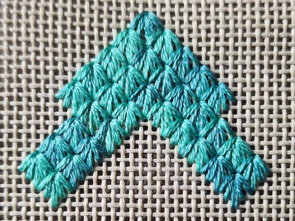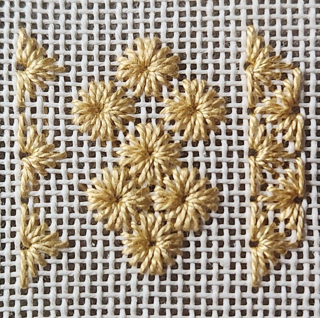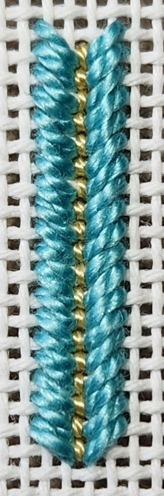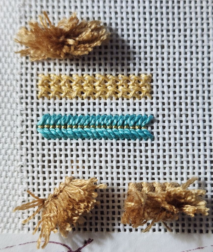 I used a 12 stranded Soie d’Alger without stranding it in this small sample. It feels more secure than the way I’ve stitched it previously. I only did a small sample. It’s not one of my favorites but useful when you need something fluffy.