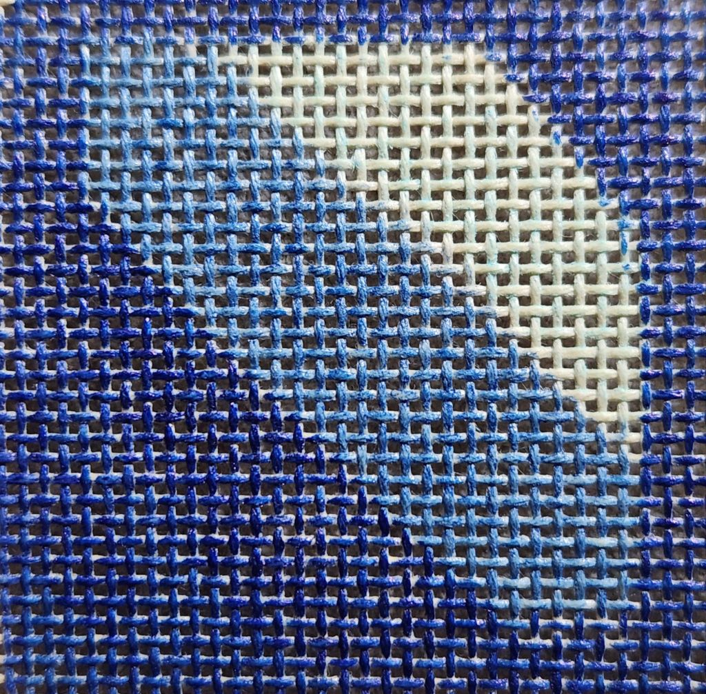 The tent stitch is small, and so it recedes for a good background stitch. And the paint shows through. I used Watercolours 234 Celestial Blue, which has some color change but not a whole lot.